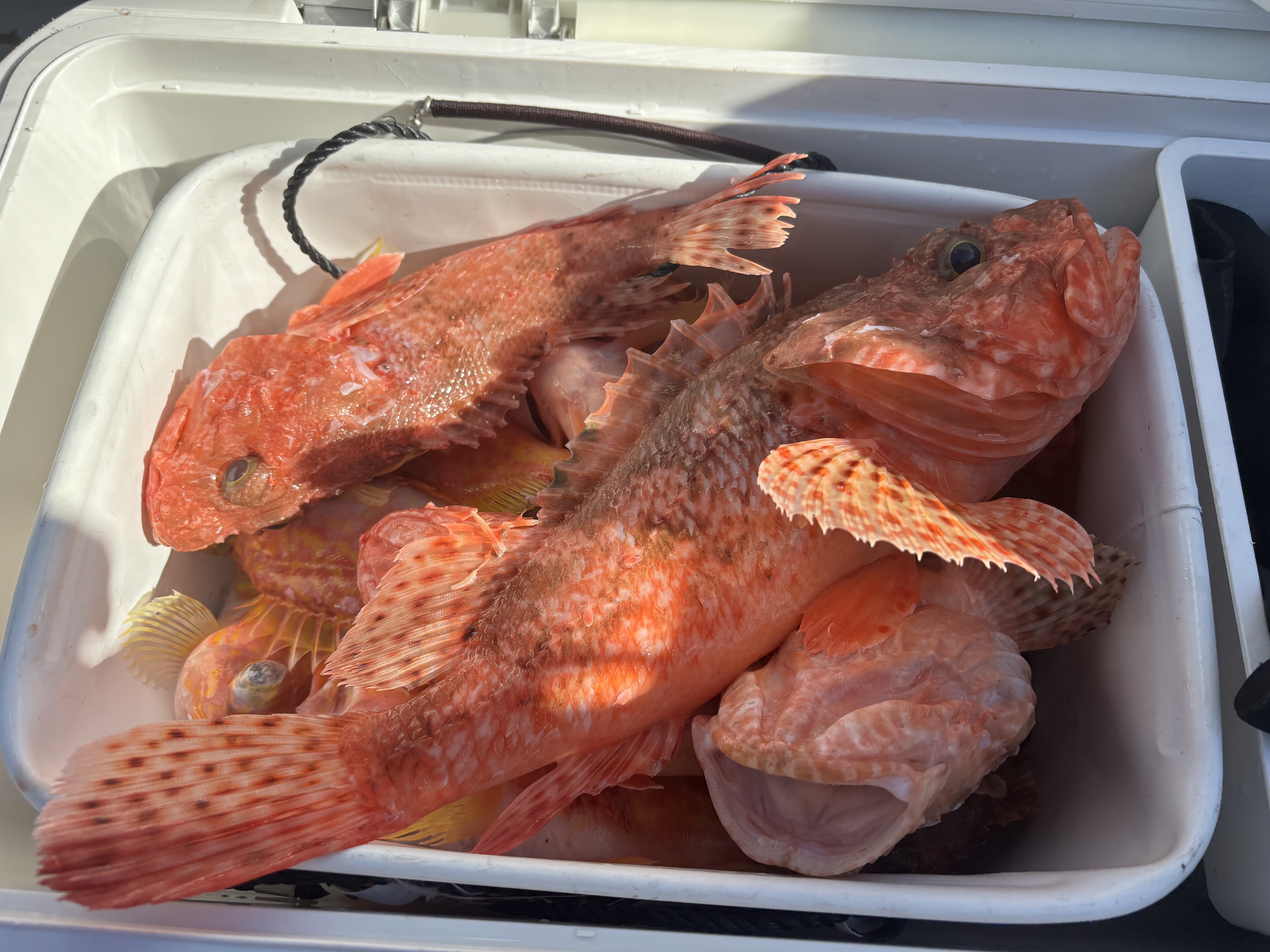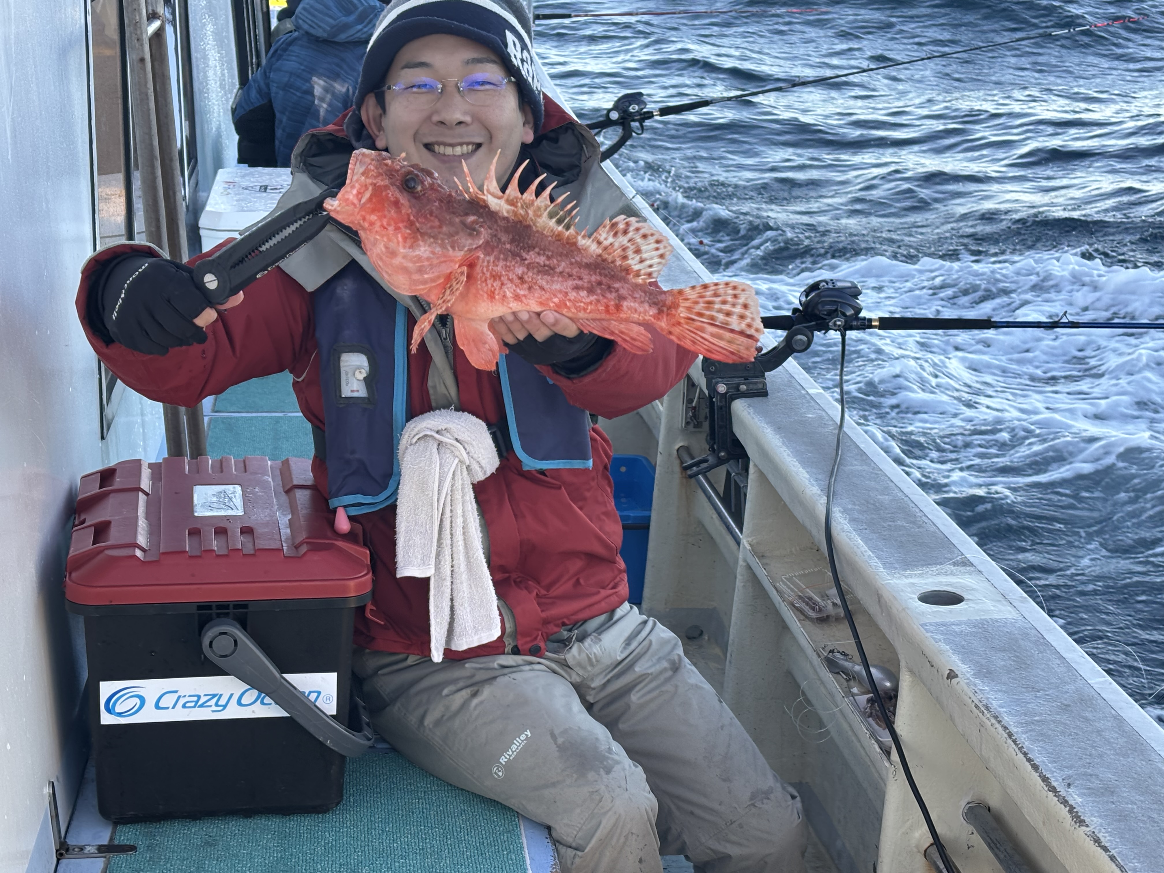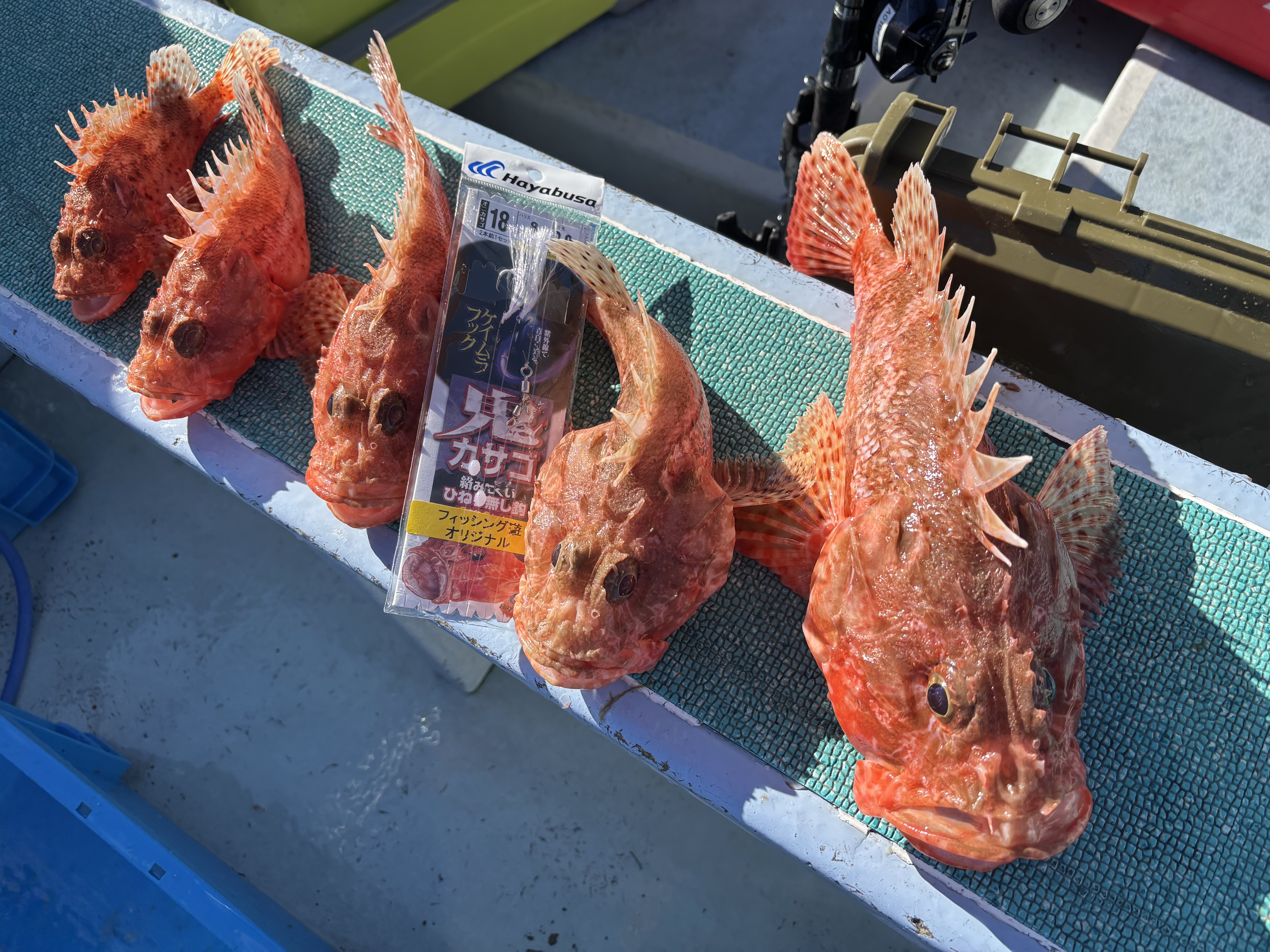 国崎 国盛丸さんで鬼退治!に行って来ました!ポイントは、大王沖の140メートルから150メートルのラインです。出船から1時間ほど走りポイント到着!エサはカツオのハラモ、サンマの切身、ホタルイカ、イカの短冊など、アピールに海毛虫も使用しました!仕掛けはフィッシング遊オリジナルの2本針仕掛で、オモリは150号を使いました。ポイント到着1投目か、アタリが出て本命ゲット!ポイントに付け直す度にアタリ、本命はもちろんアヤメ、ユメカサゴに、レンコダイなど釣れています。自分は鬼5匹、アヤメカサゴ多数、レンコダイ2匹と大満足の釣果です!これからが美味しい鬼カサゴ、皆さんもどうですか!