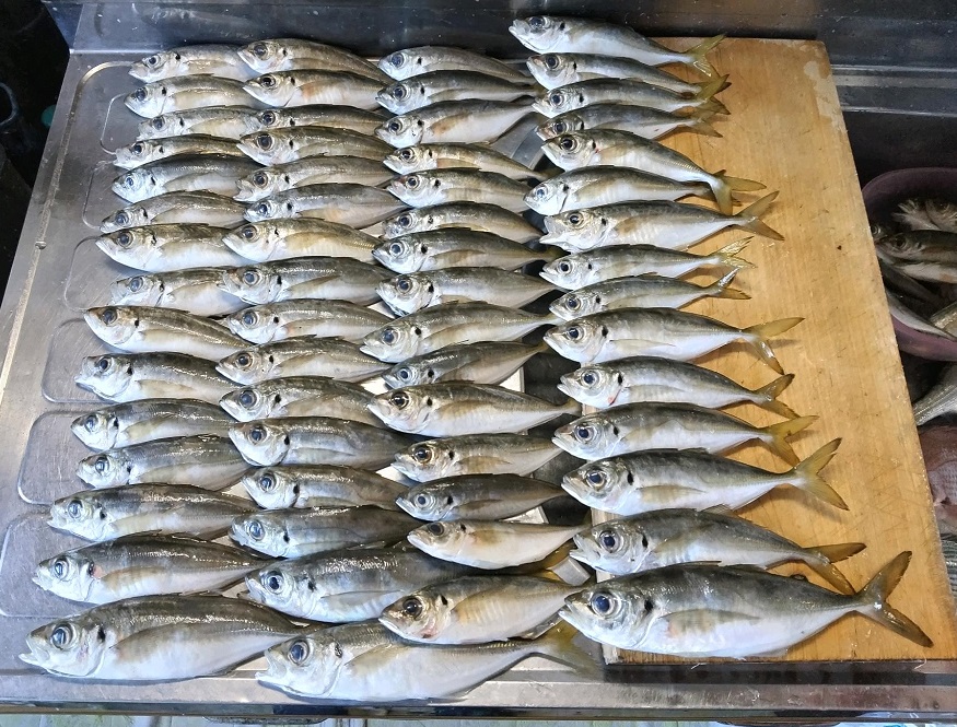 昨夜の風ではまともに探れていないのですがまずは夕暮れをアジのチエックから入ります。すぐにパタパタっと釣れてアタリが無くなりました。まだ群れが集まりきっていないのでセイゴを見に行きポイントに着くと先行者ありなので離れた場所から入り投げますが当りません、しばらく投げてやっと1匹確保して先行者が帰ったのでそのポイントに入ってみると1発でヒット!次をバラシてすぐに次を掛け確保しますが反応が少ないので一端休憩してからもう一度入り直すとパタパタっと釣れて沈黙なのでアジの確保向かいます。釣れたセイゴは5匹でした。釣り場に着いて投げるとすぐに反応が出て1投1匹ペースでアジを追加レンジを考えながら探るとイイサイズのアジも釣れます。途中釣り人が隣に入り探る範囲が減ったので逆に動いて投げるスペースを作りアジを追加して2時半まで頑張り48匹を確保、前半と合わせて60匹釣る事が出来ました。