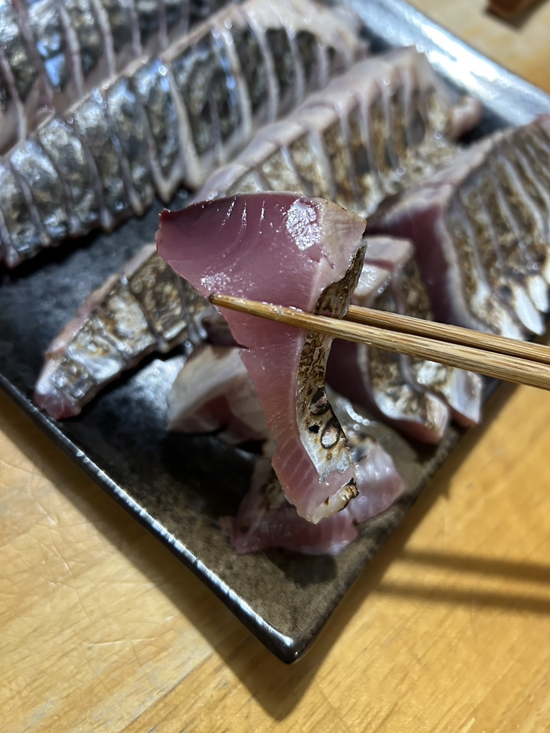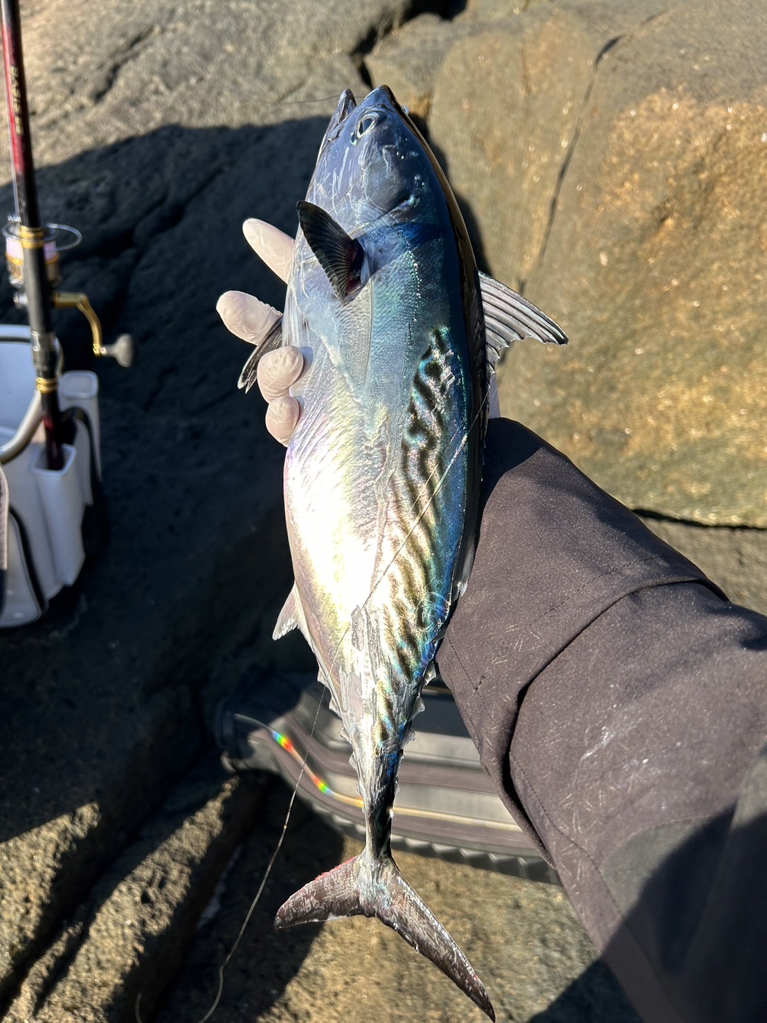 ダツか?と思いながらも同じコースを流してみると今度は強烈なバチバチアタリ!ダツだと思い込み磯際まで寄せてくると左右に走り出したのでヤイトガツオと判明笑笑