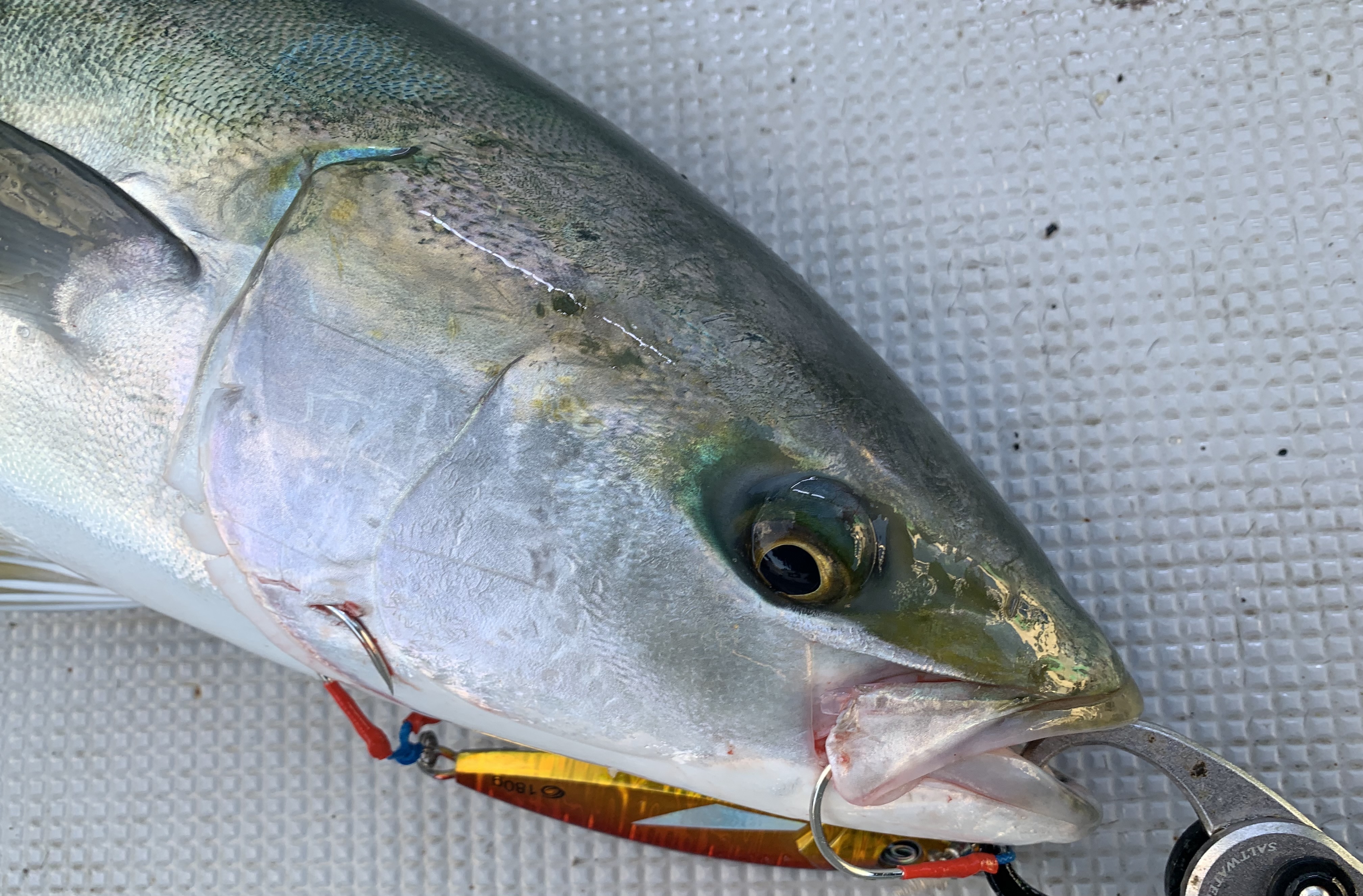 エスグライド180g赤金ゼブラで開始!!ボトムに反応あるも、ワンピッチジャークで中層まであげてくると、痛烈バイト!!いい型のワラサ!!追っかけてきてたんですかね(´▽`)