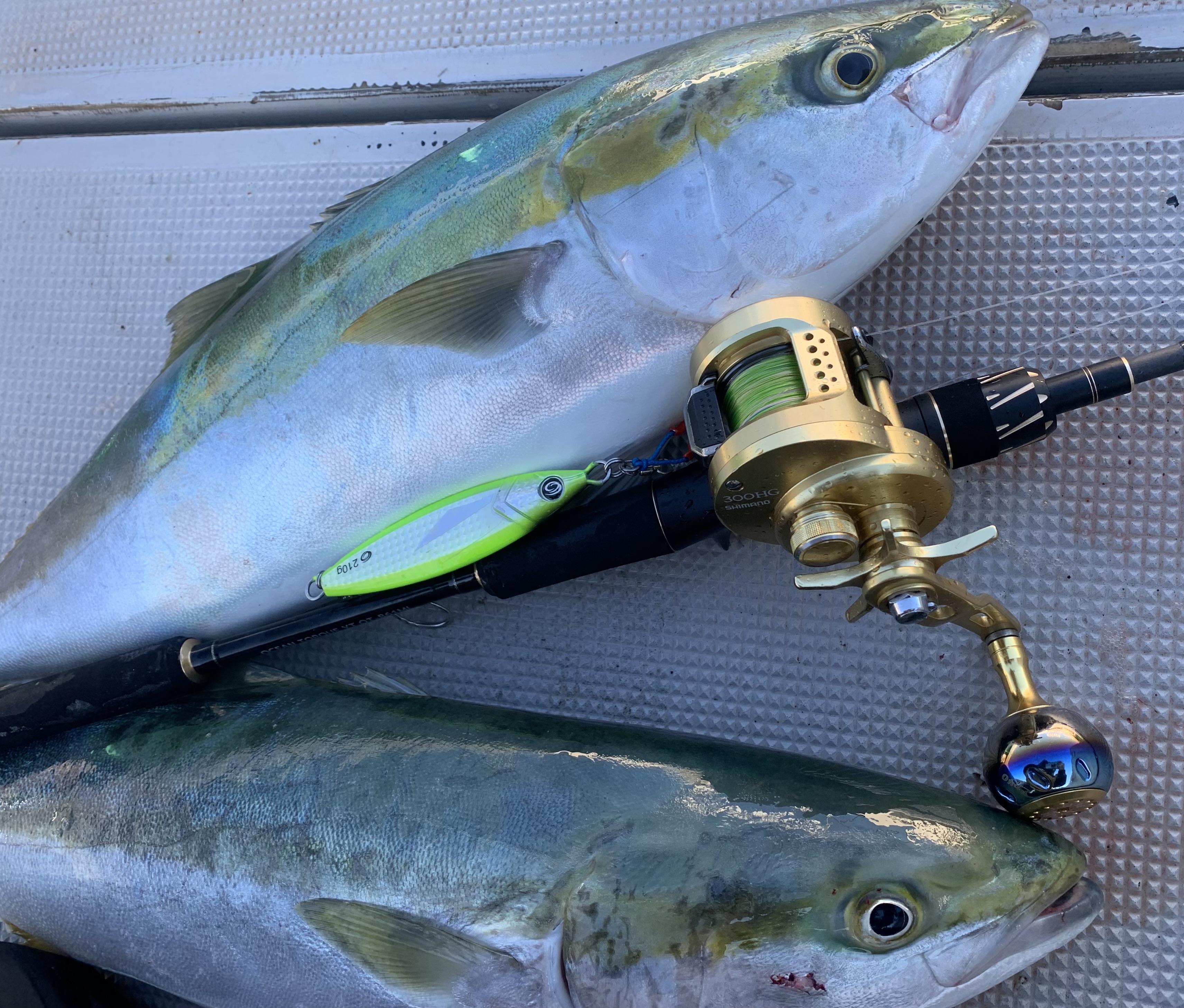 やはりエスグライド!フォールが強い!!竿はクレイジーオーシャン オーシャントルクYT61MLを使用!!しっかり曲がり、リフト力も申し分無し!!伊勢湾ジギングにはこれ1本でいけます!!