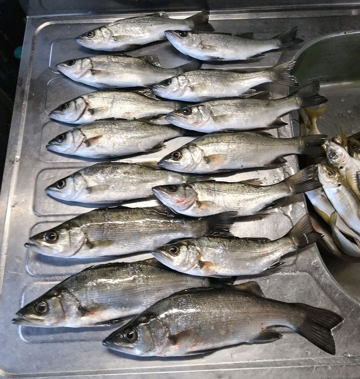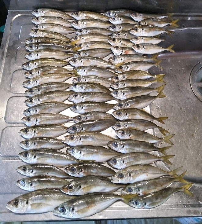 アジ二晩で63匹を確保できました。前回は2人して12匹ですから満月と大潮ド干潮は難しいのがわかります。セイゴは全体で47匹でした。