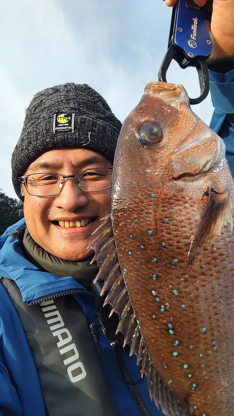 水深は浅く3~4Mほどで長い竿は要らないかなという感じがします。エサは漬け込んだエビと皇帝カイザーです。他にも用意しましたが2種類くらいに絞った方が良いでしょう。イケスの中には網の目を搔い潜ったアジが回っていてエサ取り?のように邪魔をします。カイザーに変えると一発で真鯛がきました。さらにクロソイ&真鯛の放流もありテンションがあがります。この日は上からひらひら落とし込むと真鯛が食いに来るというパターン?を見つけ、真鯛連発で楽しい時間を過ごしました。