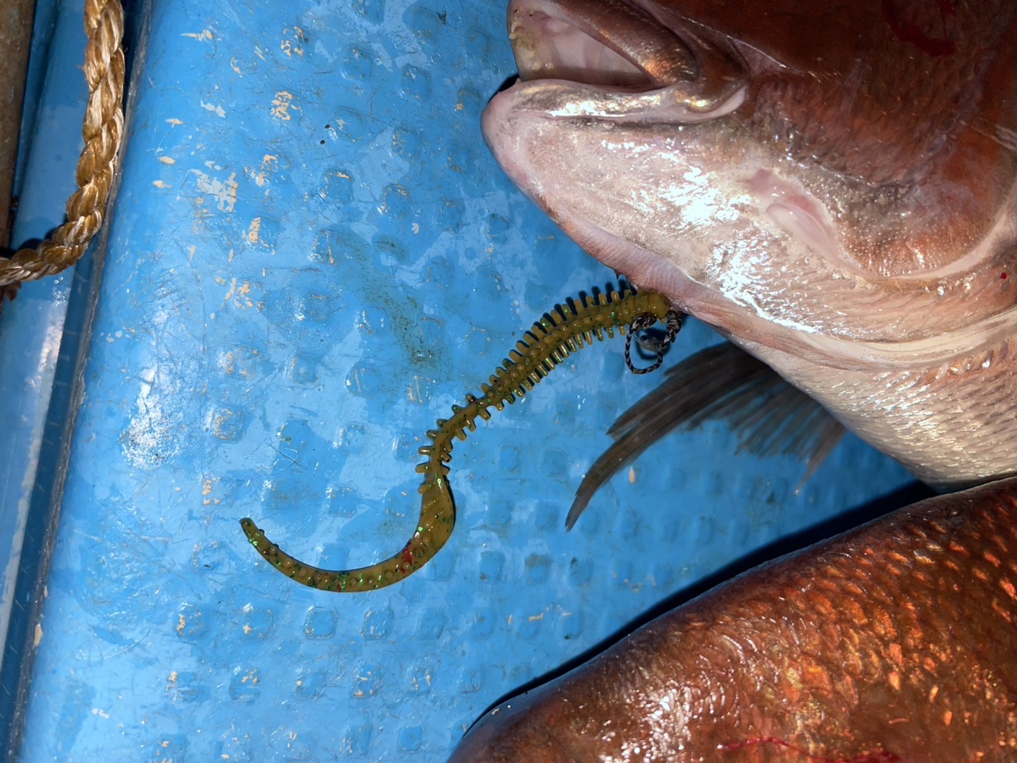フックはカチッとタイラバM。赤のネクタイとトレーラーに海毛虫カーリー茶バチ、海毛虫Jr青バチをセッティング。1番上の針にカーリー、その下にJrを付け1番下は何もなし。というのもワームを噛みにくるので上の針を食わせ下の針はどっかしらに掛かれっ!て感じです。