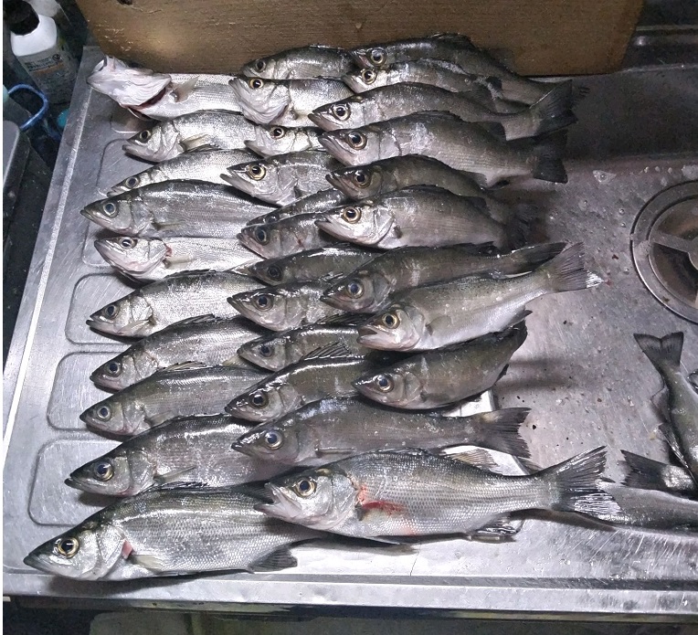 移動して休憩してから昼間の投げてみましたが細い藻が絡まり釣りにならず夕暮れまで休憩です。釣れたセイゴは31匹でした。