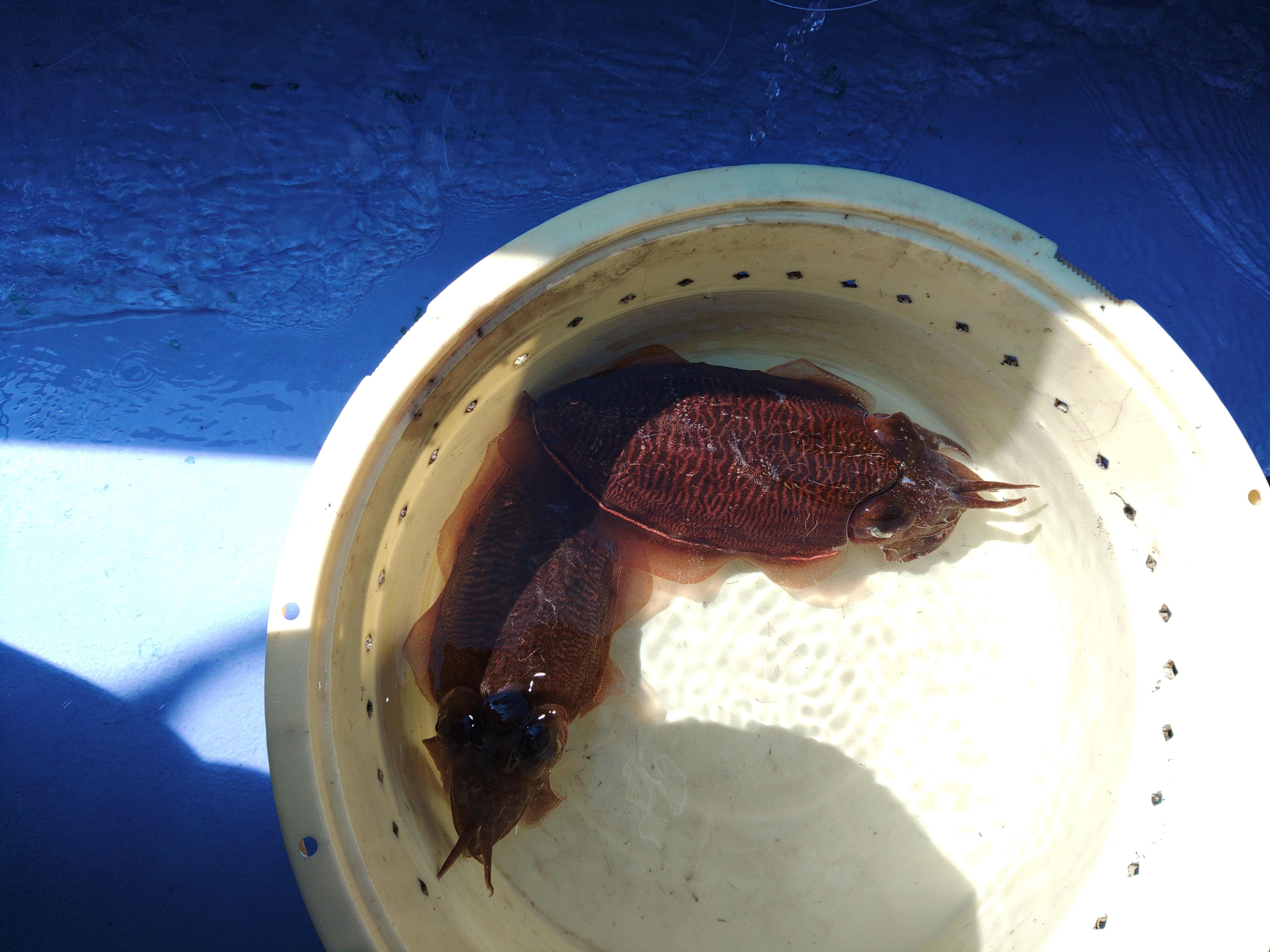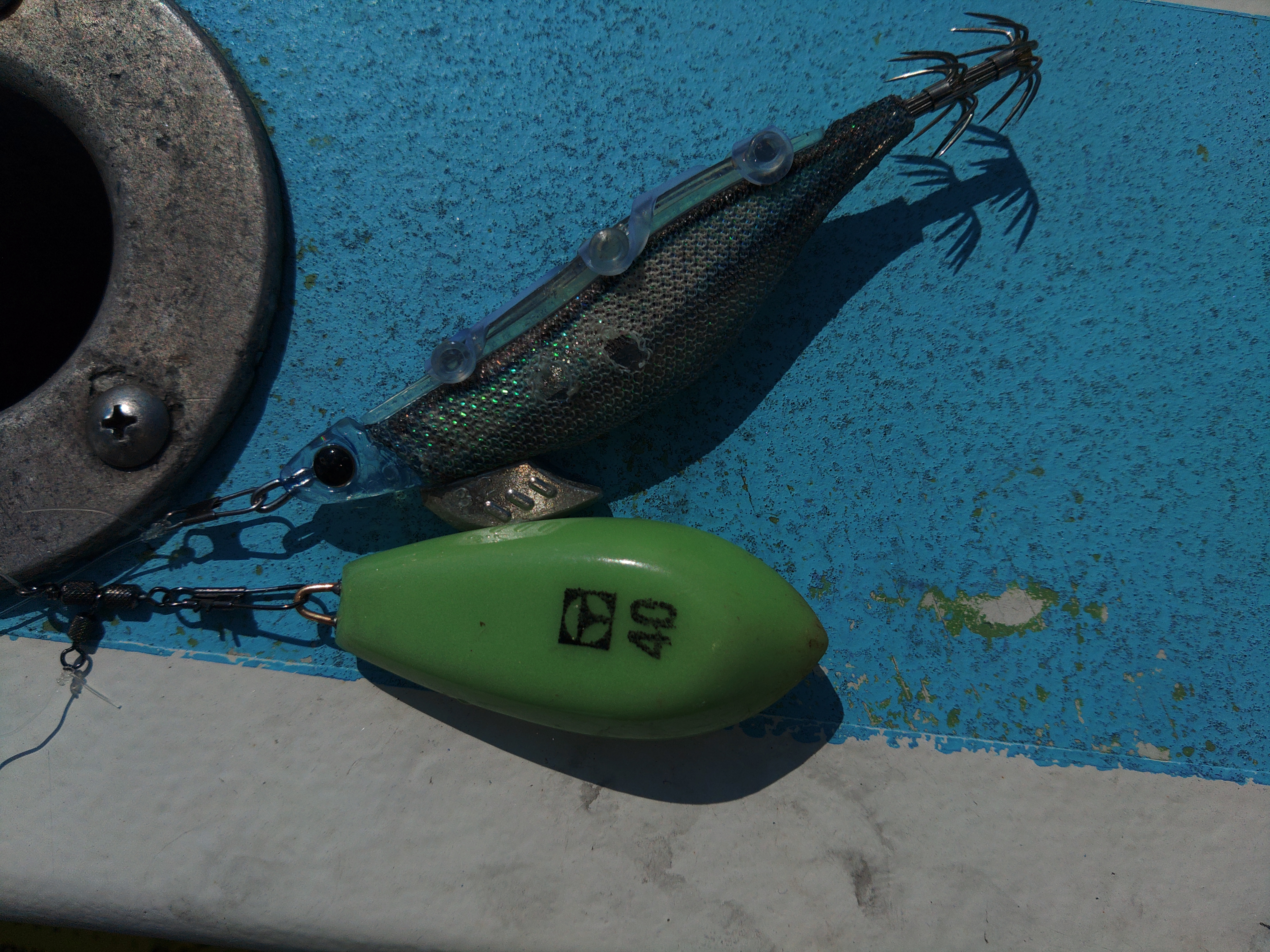 今年好調のコウイカを南知多の忠栄丸さんで釣行してきました。連日情報では4~5杯の釣果があり、当日は3杯を目標にしてAM6:30港を出ました。ポイントは神島周りで30分ほどでポイントに到着。水深60~65Mで底を這わすように釣り始めました。まずはヤマシタのモグモグサーチ(ピンク)にキビナゴをセットして釣っていましたが反応なし・・・。しばらくして今度はデュエルのパタパタ3.5号(グリーン)にチェンジ!しかし、これも反応なし・・・。船中でもポツポツと釣れてはいるものの反応が少なく、船長のアナウンスで「今日はイカの活性が低いので、オモリはべた底でエギを引きずるようにして海底から浮かさずに10~15秒ぐらいで大きくシャクってあたりをとって下さい。」との指示があったので、エギのリーダーの長さを1ヒロ(1.2m)ぐらいに長くして、エギもモグモグサーチ(グレー)にしてキビナゴをセットして再スタート。 するとAM10:00過ぎに竿をシャクッタ時に重みがあったので巻き上げると少し小型の20㎝ぐらいのコウちゃんがヒット!なんとかボーズは回避できて気が楽になり釣り続けるとすぐにまたヒット!今度は一回り大きな30㎝弱のコウちゃんでした。その後は潮も止まりアタリも無くなりPM12:30に納竿となりました 。船長のアドバイスも的確で楽しく釣りが出来ました。