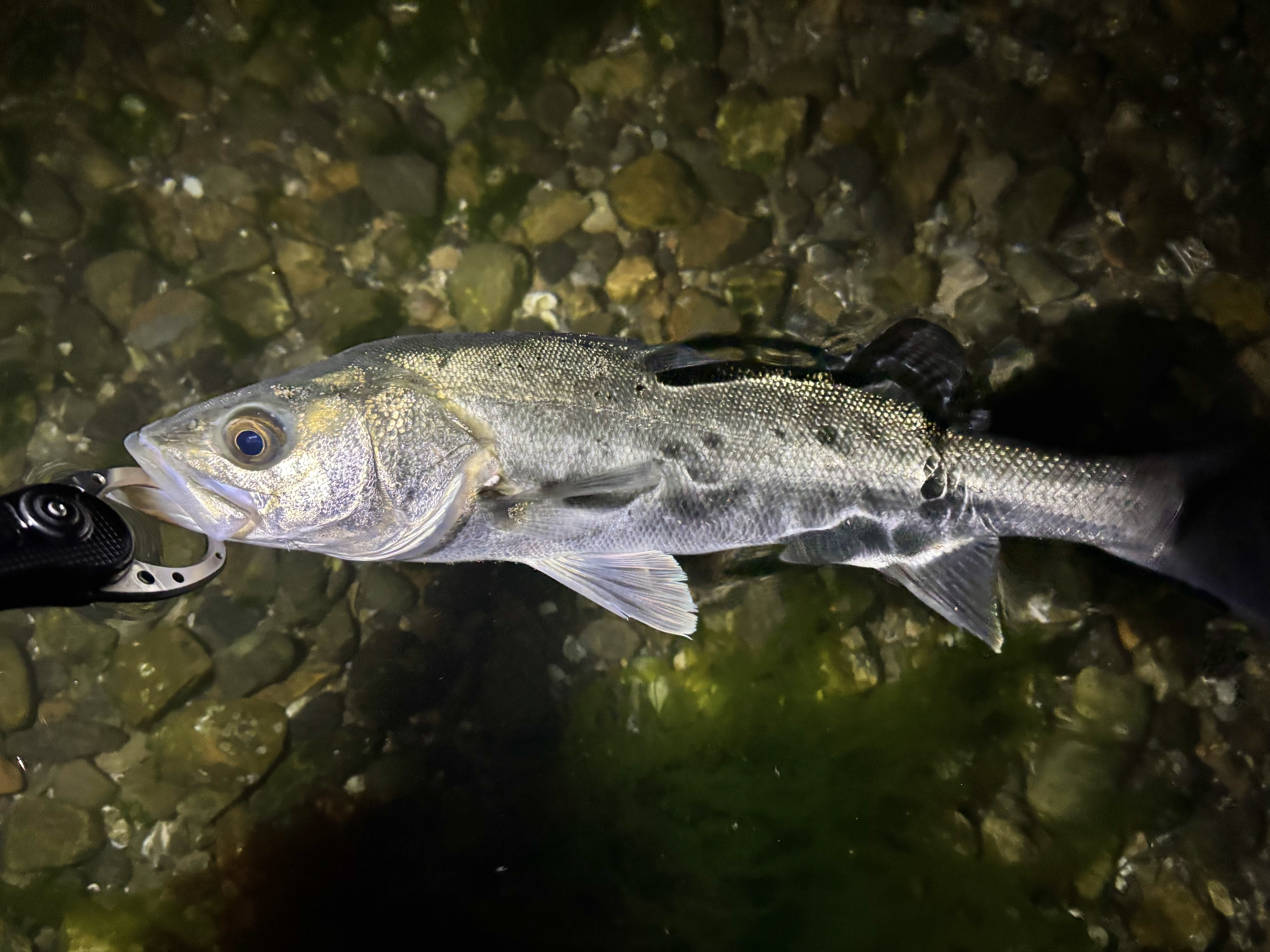ワンチャンスあると思いカラー・シルエットを考慮してSPM65のSシラスをチョイス。トロロのような藻を引っ掛けない速度でリトリーブ、時々フォールを入れて喰わせの間をつくるとコツンという超ショートバイト。正体は40㎝程のシーバスでした。