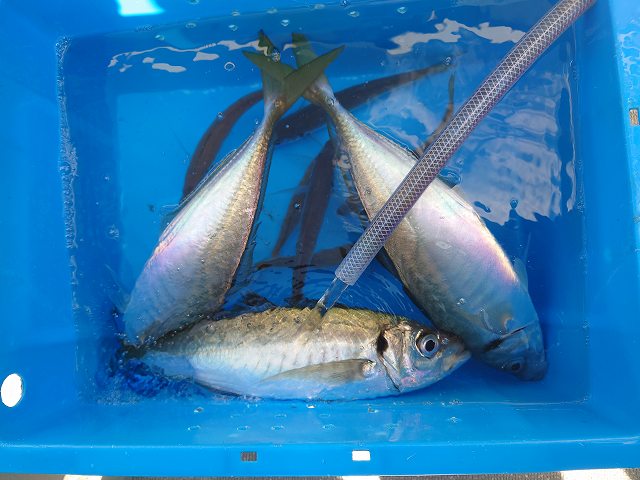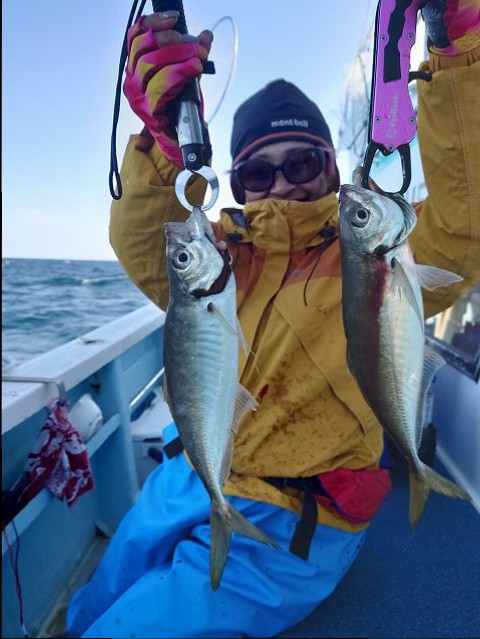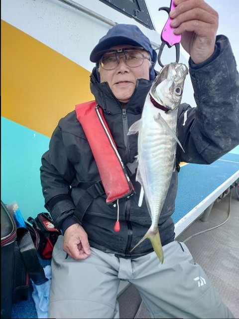 国崎の勝丸さんで大アジにハマったお客様と釣行してきました。今回も大潮の上げの時間帯での釣りでした。今回は右舷トモの釣座、潮はミヨシの方へ流れていますが緩やかでオモリ80号使用。先週まではいい釣果でしたが今週に入り食い渋りのようです。仕掛けは緑スキン3本針ハリス3号、アタリが出ないためポイント移動、そこでまずは潮下のミヨシの方にいいサイズのアジが連発、今度は私たちのトモでもポツポツとアタリが出て40cmクラスのアジが釣れましたがその後が続きません。ミヨシも同様で食いが悪いようです。夕方の時合で連発しましたが良型は全部途中で針外れで数上がりません。流れが緩いと釣り座関係なくポツポツ釣れるようです。時合もすぐに終わり私グループは皆2~3匹の釣果。勝丸さんからは潮上や食い悪い時や根気よくこまめに打ち返すしかないよというアドバイスでした。例年4月くらいからが釣りやすく数も上がるのでこれからが楽しみです。