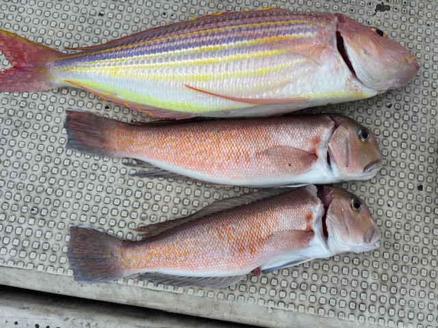 鳥羽、日誠丸さんで白甘鯛釣りに行って来ました!天候が荒れていて.前日まで出船出来ないと思っていましたが、出船時間をずらして、出られるという事で、8時出船で乗船!個人的に今まで、何度も甘鯛釣りは挑戦しましたが、今だ本命を、釣った事がない…今日こそはと意気込み、最初のポイントは水深30mから40mオモリ50号、天秤、3本針、ハリス4号で狙います。上からアオアソメ、ホタルイカ、オキアミをつけて様子見!程なく同船者にアタリがあるが、痛恨のバラシ!その後すぐ私にもアタリ!上がって来たのは30cmほどではありますが、本命白甘鯛!初めて釣れた魚はサイズ関係なく本当に嬉しい!その後もう一枚ついかし、ジャンボイトヨリのオマケ付きで終了!私はサイズが出ませんでしたが、同船者は見事41cmをゲットしていました!船長ありがとうございました!
