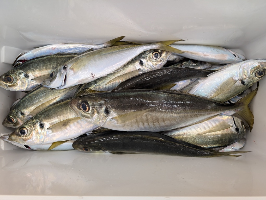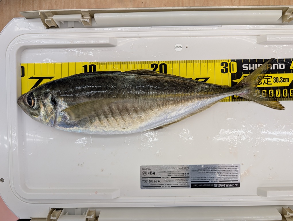 3月24日に小川港の大友丸さんでアジ五目に行ってきました。当日は午前2時30分出船。凪予報でしたが、出船してみると前日のうねりと予報以上に風もあり釣りにくい。1投目から釣れるも巻上げ途中にバラシ。ドラグを効かせてゆっくり巻上げてもバラシが止まらない・・・その後も釣れ続けるも大型は少なく30㎝前後が中心。その後ポイントを移動し、船中では大型アジが釣れだしますが、私はなかなか釣ることができず撃沈。結局25㎝~38㎝までのアジが25匹。その他にはニベやチャリコなどが釣れました。竿頭の方は最大44㎝までのアジを35匹の釣果でした。焼津沖のアジ五目は好釣果が続いていますので、近いうちにまた行きたいと思います。