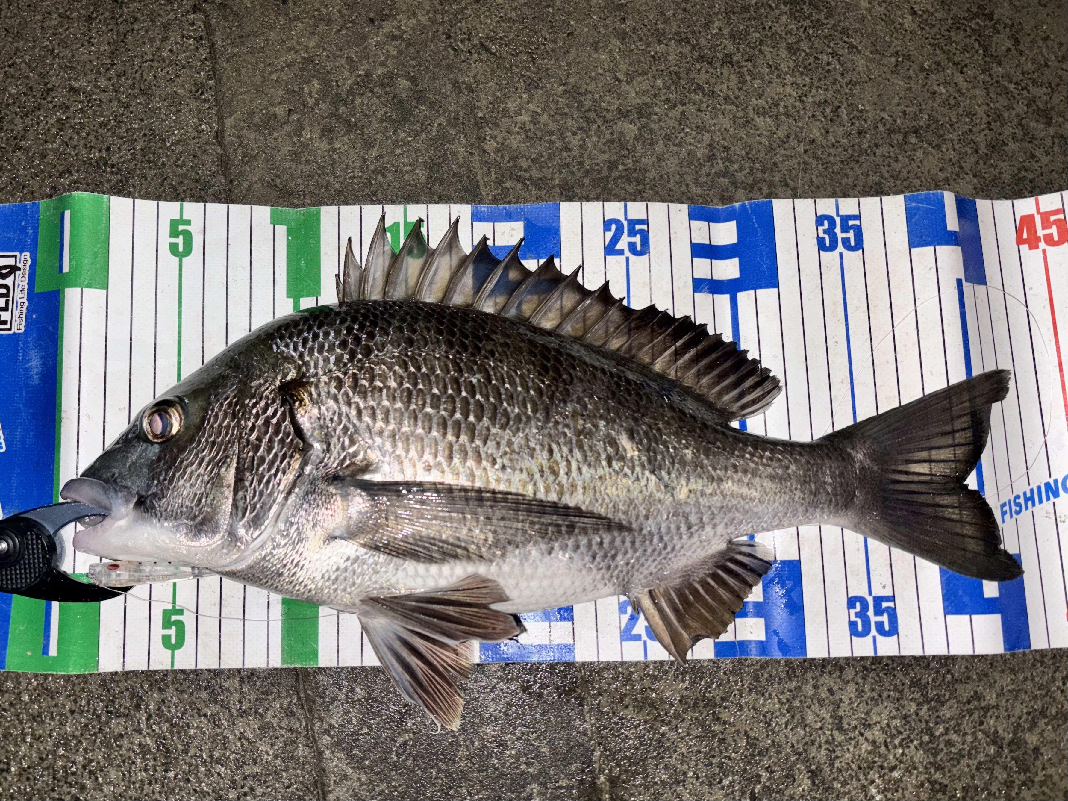 昨年もいい思いをしたメバル用プラグでマイクロベイト攻略をする事に。使うルアーは気になっていたシンキングミノーのダイワ「ふらり55S」。大潮の速い流れに乗せてドリフトさせていくと手前で早速ヒット!小さくてもパワフルなヒラセイゴでした!その直後に同じパターンでキビレとフグが立て続けにヒット!一旦流れが止まって、再度流れが出始めたタイミングで40オーバーのクロダイも釣れてくれました!