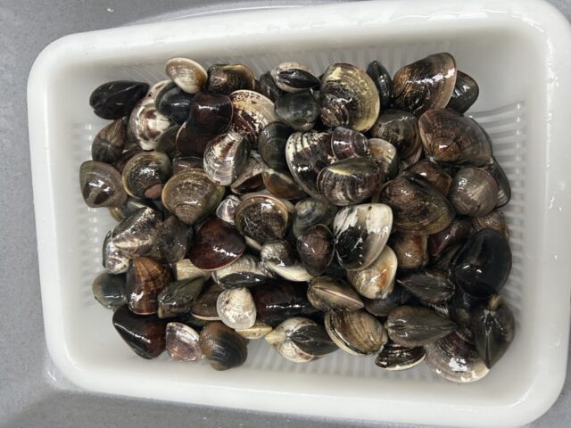 少し掘ってあまり取れなければすぐに移動!これの繰り返し。最後は比較的入口から近い所で堀残しがないかさぐり、最終3時間ほどで3キロ少々取れました。干潮は13時過ぎでしたがお腹が減ったので終了です。特大サイズは出ませんでしたが良型のハマグリがゴロゴロと採ることが出来ました。砂抜き、潮抜き(ハマグリはこれをやるかやらないかで味が大きく変わります)しいつもの酒蒸しで美味しくいただきました。