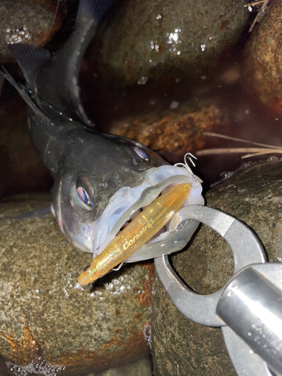 竿を立ててシャローを引いてくるとヒット!50cmくらいのシーバス。ふと足元を見るとくるくるバチが抜けているのを発見。くるくるバチには定番のコルセア65アーバンスモークダズラー!