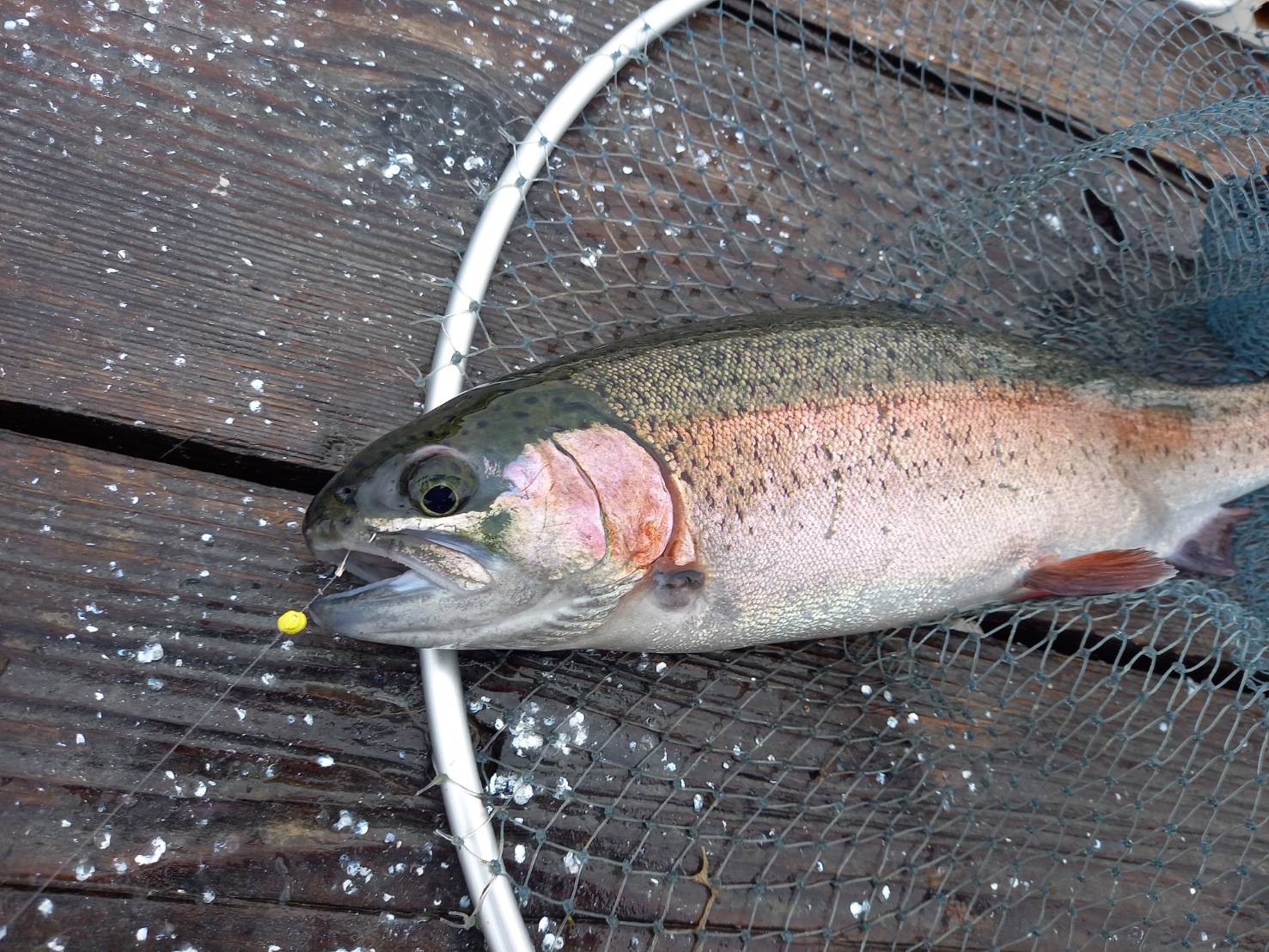 場内に時折アナウンスが流れて、開始までの時刻をお知らせしてくれます。私は釣友と3本の竿で一つのイケスを貸し切り。ゆったり快適に釣座を構えます。釣り開始までに40分ほど時間がありましたが、水宝の男性スタッフがいろいろアドバイスをくれたり、常連のお客様からいろいろ情報をいただいたり、退屈はしません。7時45分釣り開始の鐘が鳴ります。思い思いのエサを付け投入!!食わない・・・?朝一でも難易度高め!!釣友がオキアミイエローで一匹目。表層付近。私もまねてサイトでサクラマスGET!!丸々とした見事(おいしそう)な魚体!!オキアミ、ブドウ虫、丸エビのローテーションで数を伸ばします。食いが止まったタイミングで男性スタッフが常連様からボイルオキアミをもらってきてくれてパタパタと追加に成功。棚を底付近にしたり、オモリを重たくしてリアクションで食わせたり、一筋縄では食わないサーモンフィッシングはゲーム性も高く面白い。そして、白鷺サーモンも2尾釣る事ができ、最終15尾の釣果!!(釣れなくても7匹補償)さらに選べるお土産でトラフグも頂きました!!