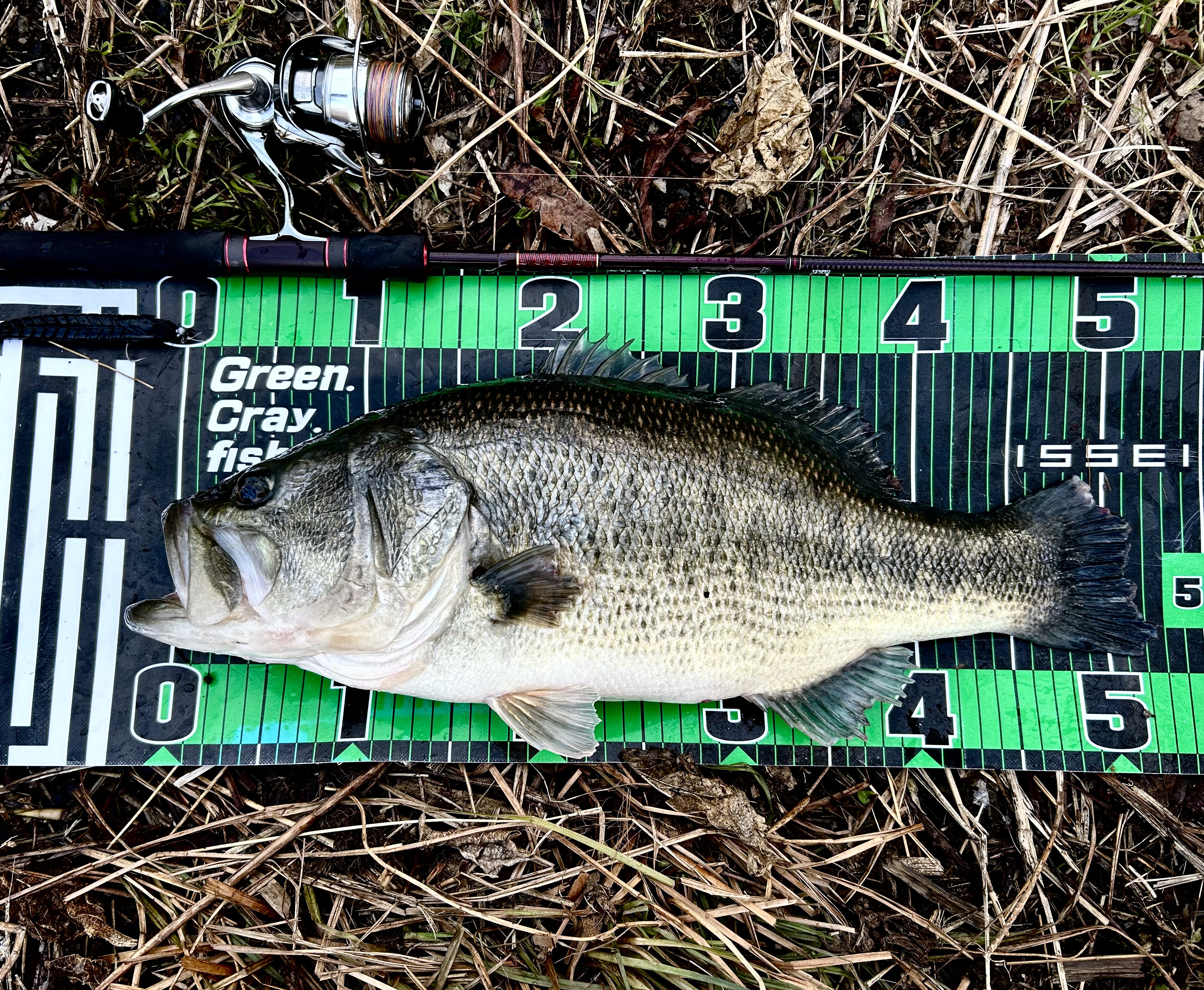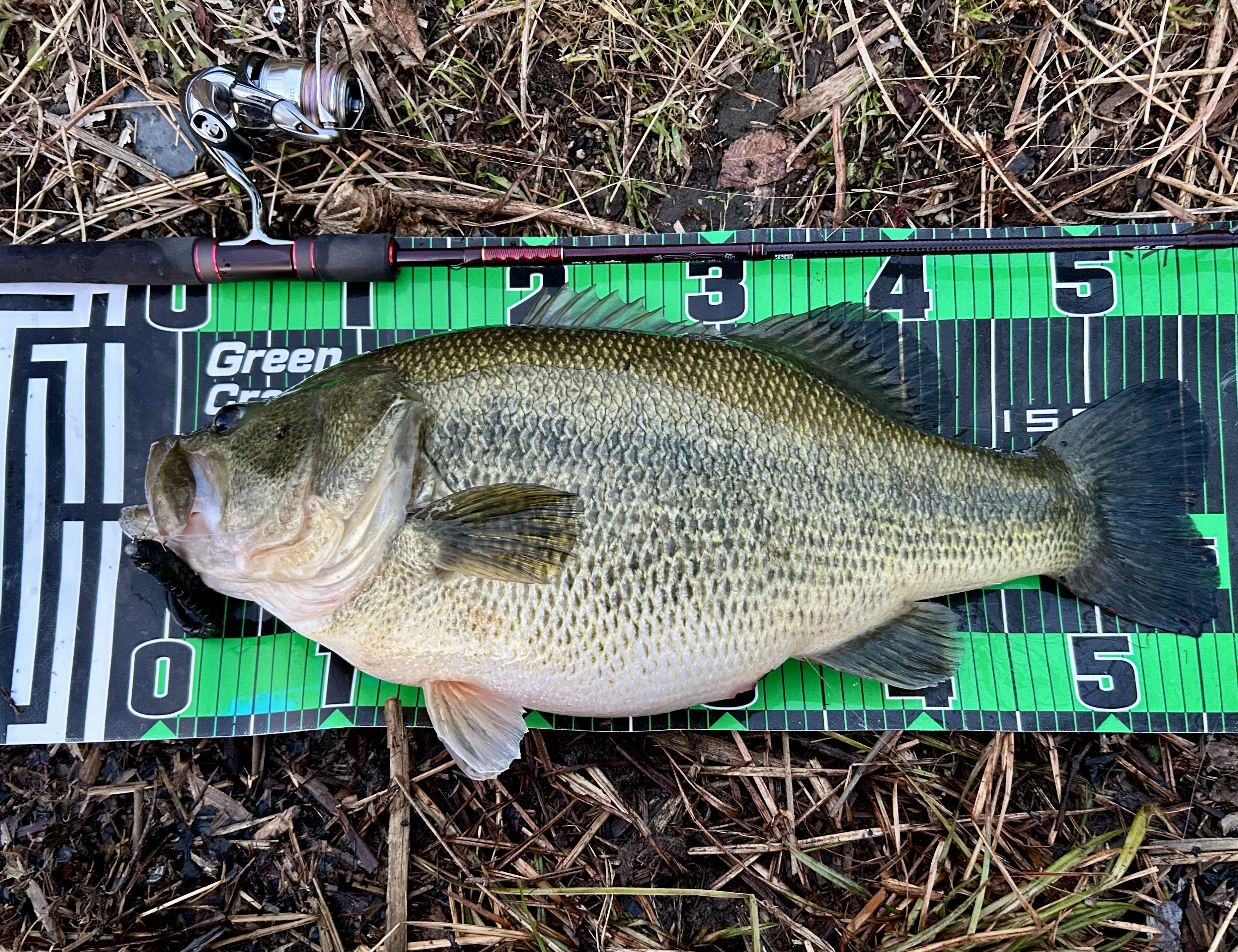 その後違うポイントをまわりますが反応なく朝のポイントへ入り直し同行者にアタリが2回とナマズがヒット。そろそろ帰ろうかと話しながらも投げ続けているとバイト!猛ダッシュでアシの方へ走る強烈な引き。擦られるか切れられるかギリギリのファイトで寄せてキャッチ!太すぎる!!56cm4585g。(はじめ計った時は4600あったんですが・・・)ある意味ロクマルよりレアだと言われているロク無しのテンポンド。ヒットルアーはカタクチワームヤバクネ5.5インチ。ヤバクネミドストがやばすぎました!