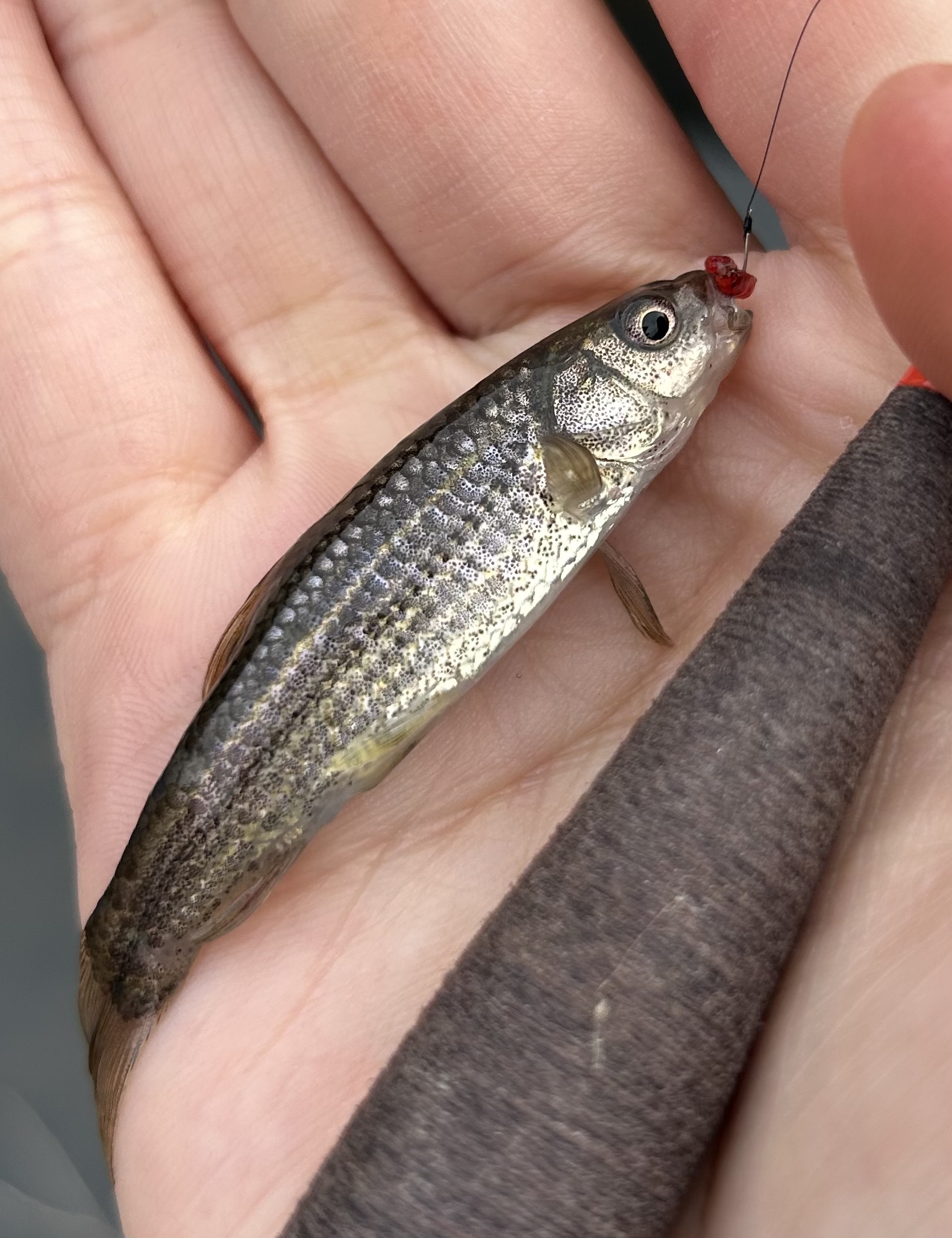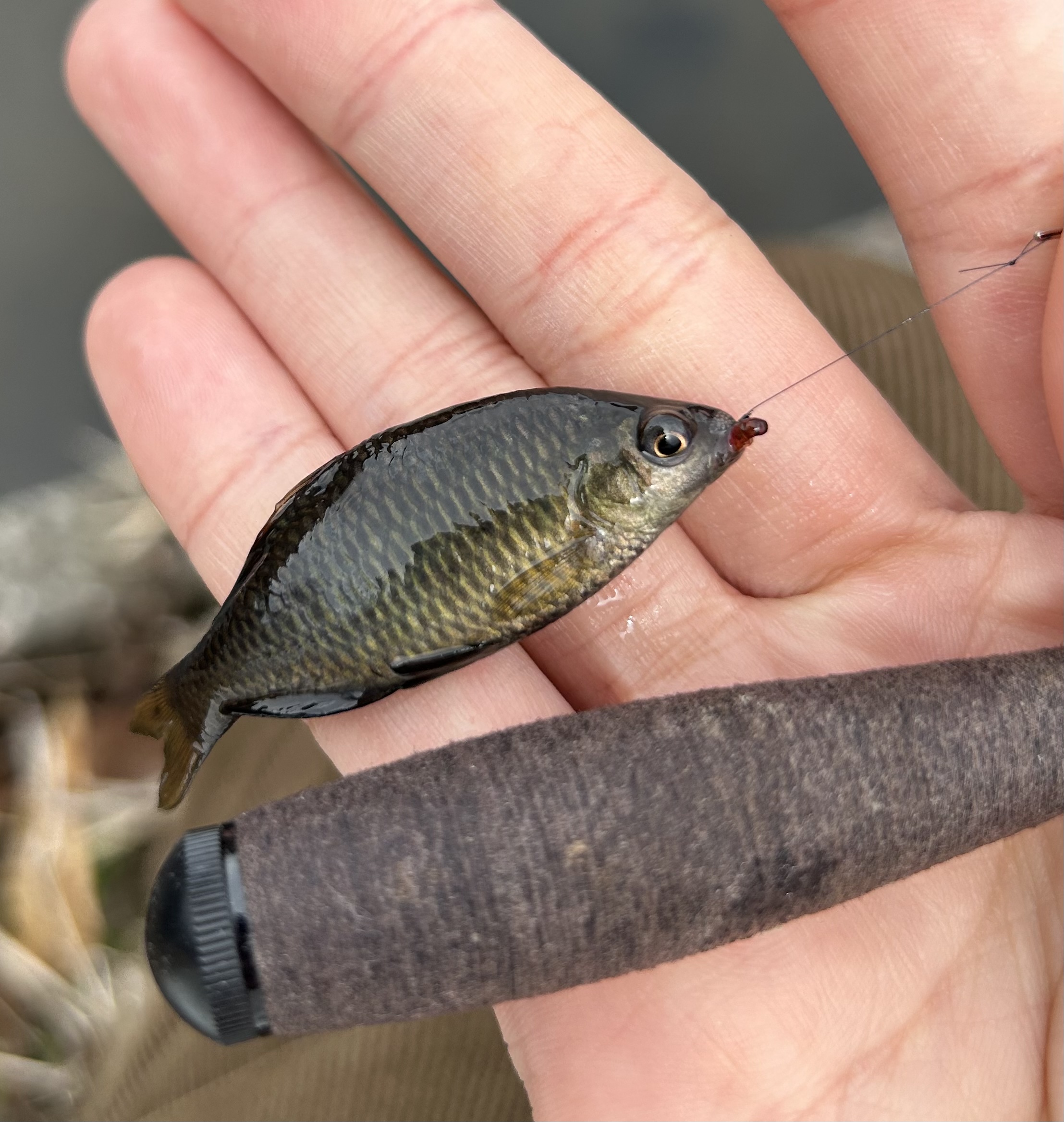 アブラボテの反応しかなく別の隙間に入れると本命ヤリタナゴ釣れました。琵琶湖水系特有の銀鱗タイプ