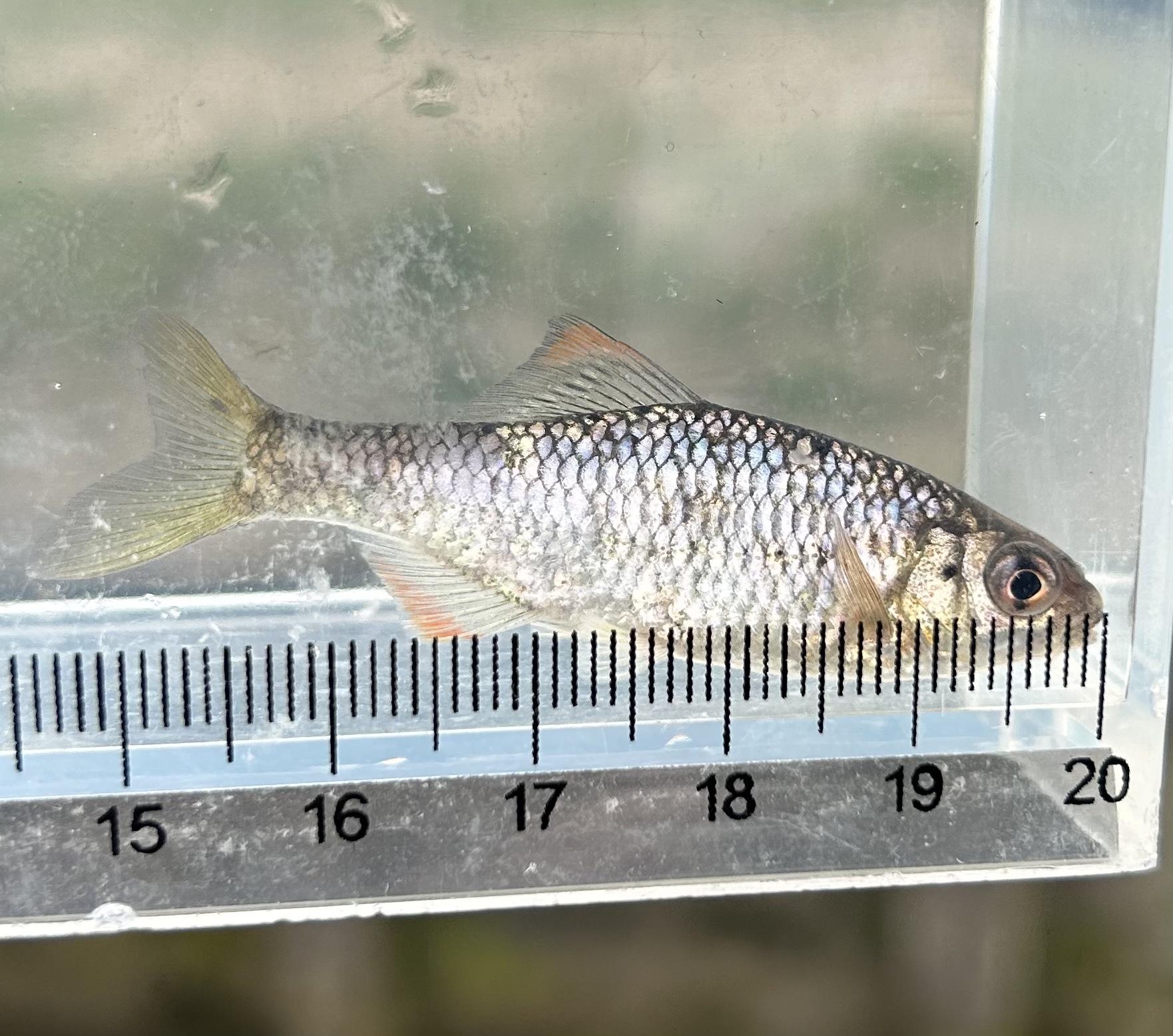 カワムツ、オイカワは沢山いますがタナゴは…?上から探すと構造物の隙間にいました!