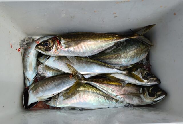 今が旬の大アジ狙いに行って来ました(^^)お世話になったのは国崎漁港、功成丸さん!午前便で5時半出船!雨、波、風すべてあり状況は…。最初のポイントは約65mで潮が早く100号スタートでしたがすぐに120号に変えました!少しして底ベタでアタリがあり大アジGET(^^)それからも飽きない感覚で大アジ追加(≧▽≦)(*´ω`*)サイズは38〜45cmと良型ばかりで楽しめました!