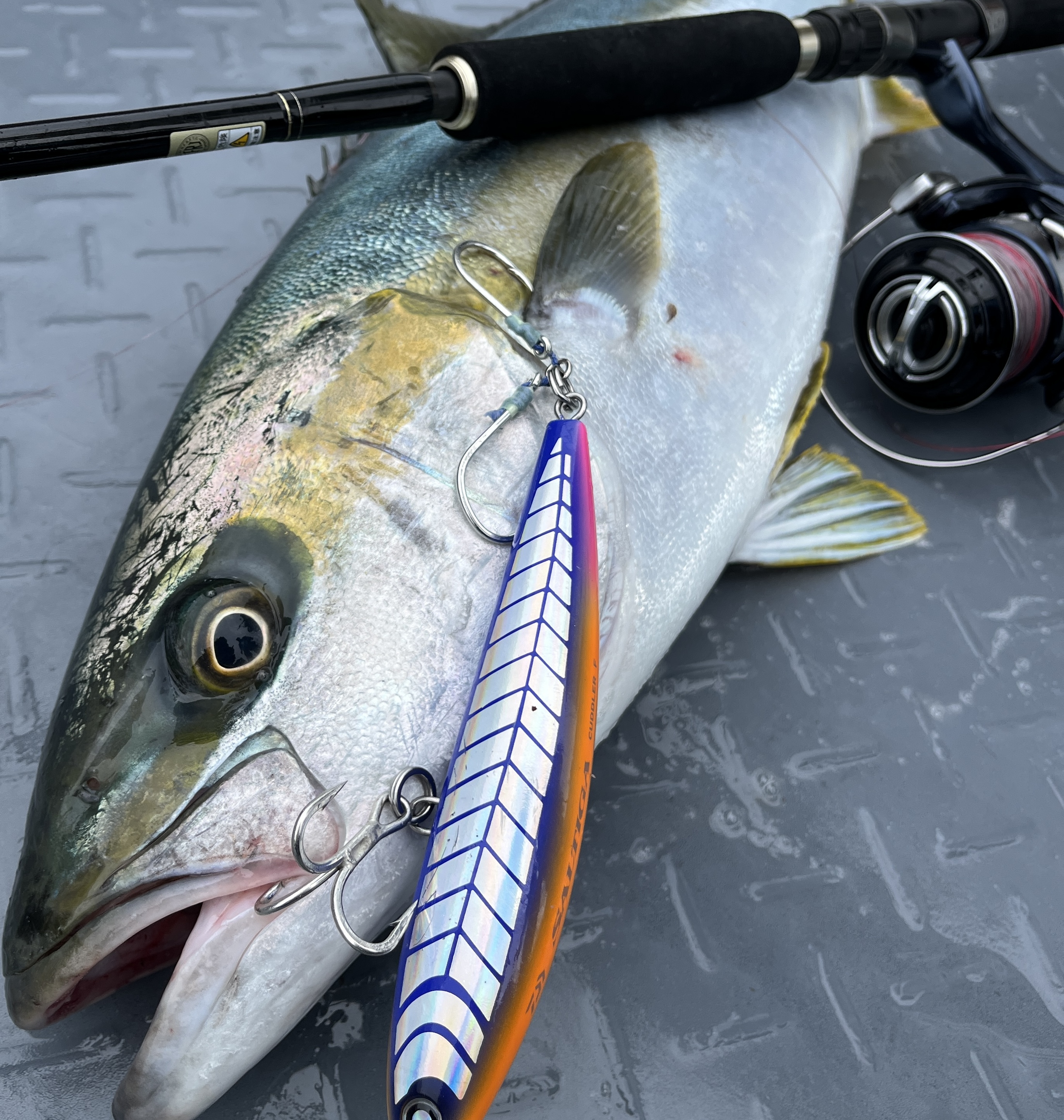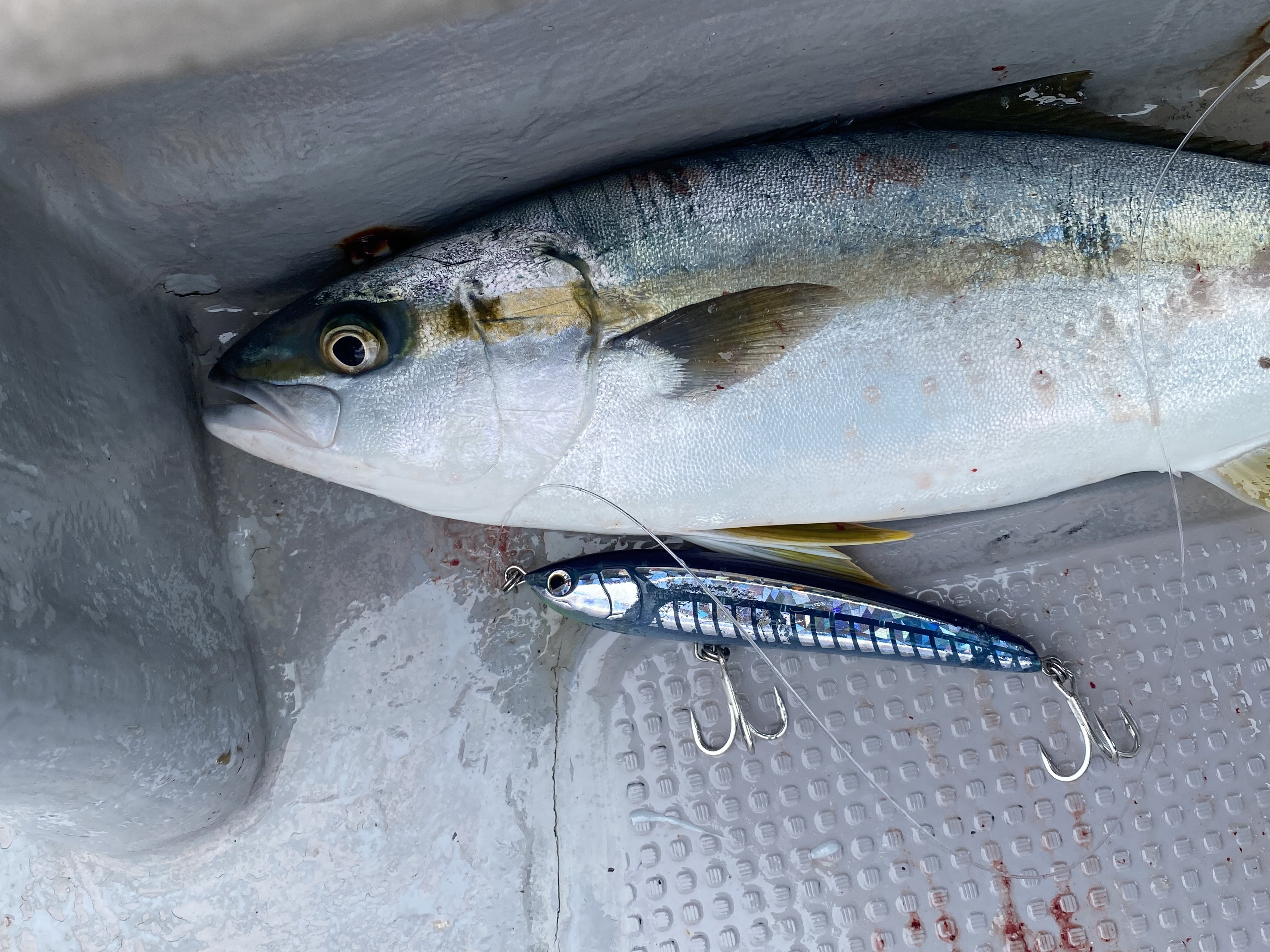 HITルアーはレガート165Fのケイムラスリッドグロー。その後、反応がなくなったので前日に購入したカドラー160Fに変更。
