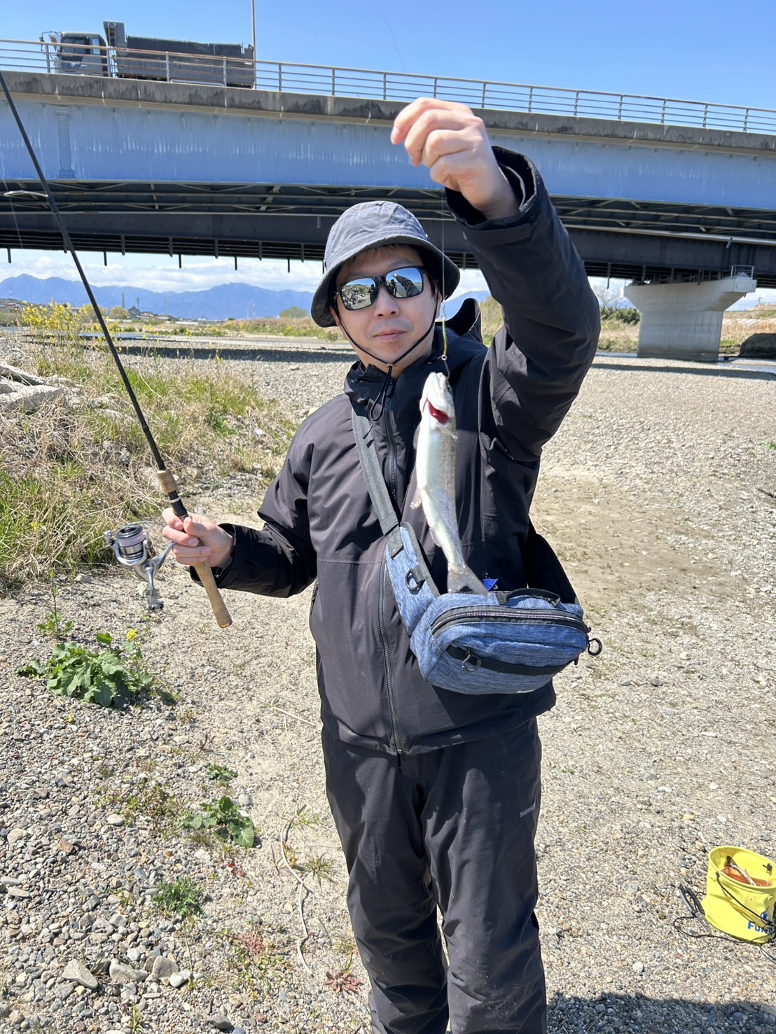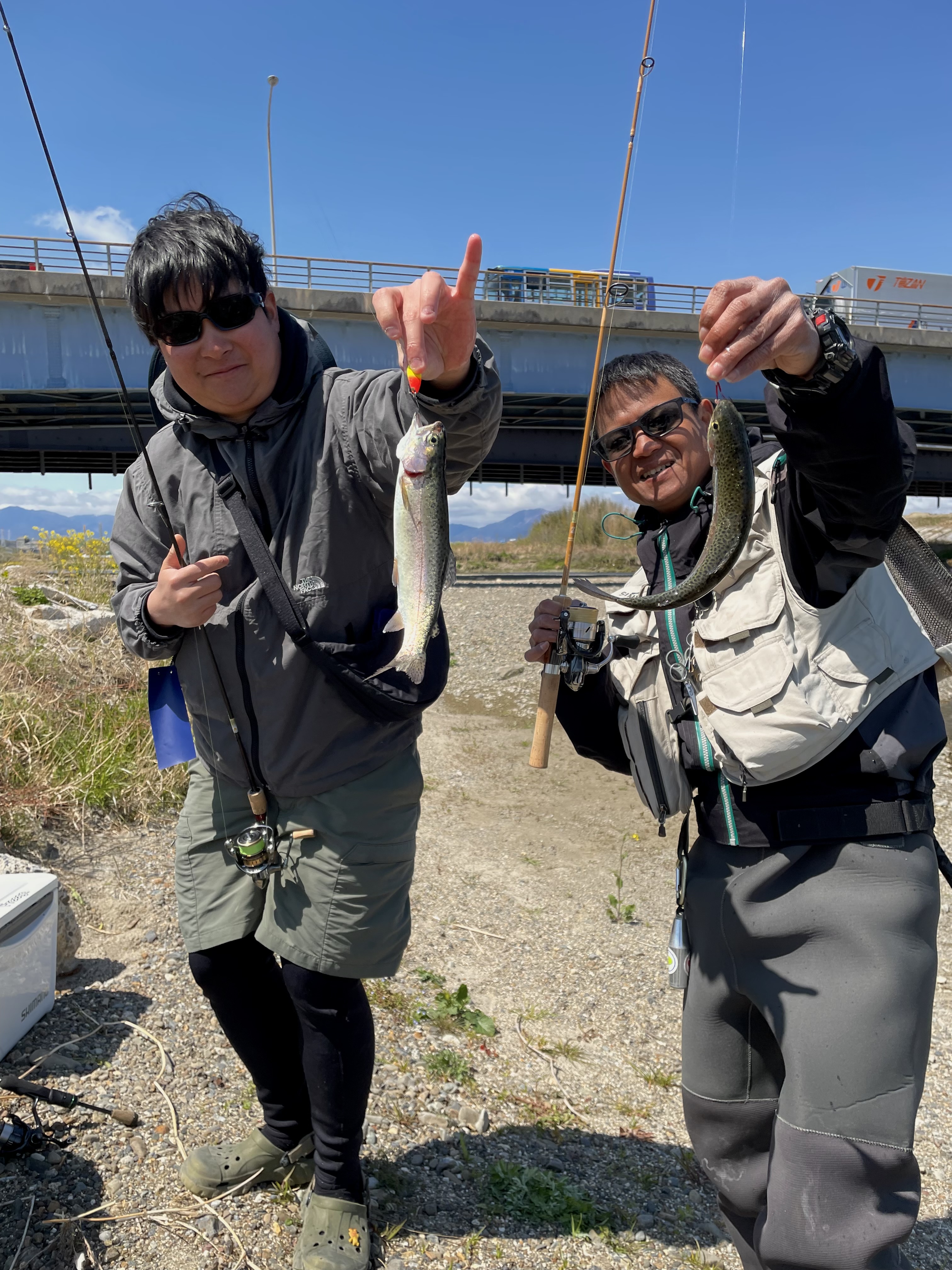 員弁川のニジマス放流日に桑名店メンバーで行ってきました!店から10分の釣り専用区に入ります。少し早く行きすぎて2時間くらい放流待ち…。橋の上から放流が始まると同時に釣りスタート。始めはなかなかヒットしませんでしたが20分後くらいに突然の地合!アタリ連発!なかなかフッキングせず難しかったですが全員ニジマスGET!少し深くて流れの緩やかな所に溜まっている感じでした。ヒットルアーはスミスさんのARスピナー3.5g、ピュア5g とダイワさんのレイブ3.5g !定番のゴールド系カラーが反応良かったです。
