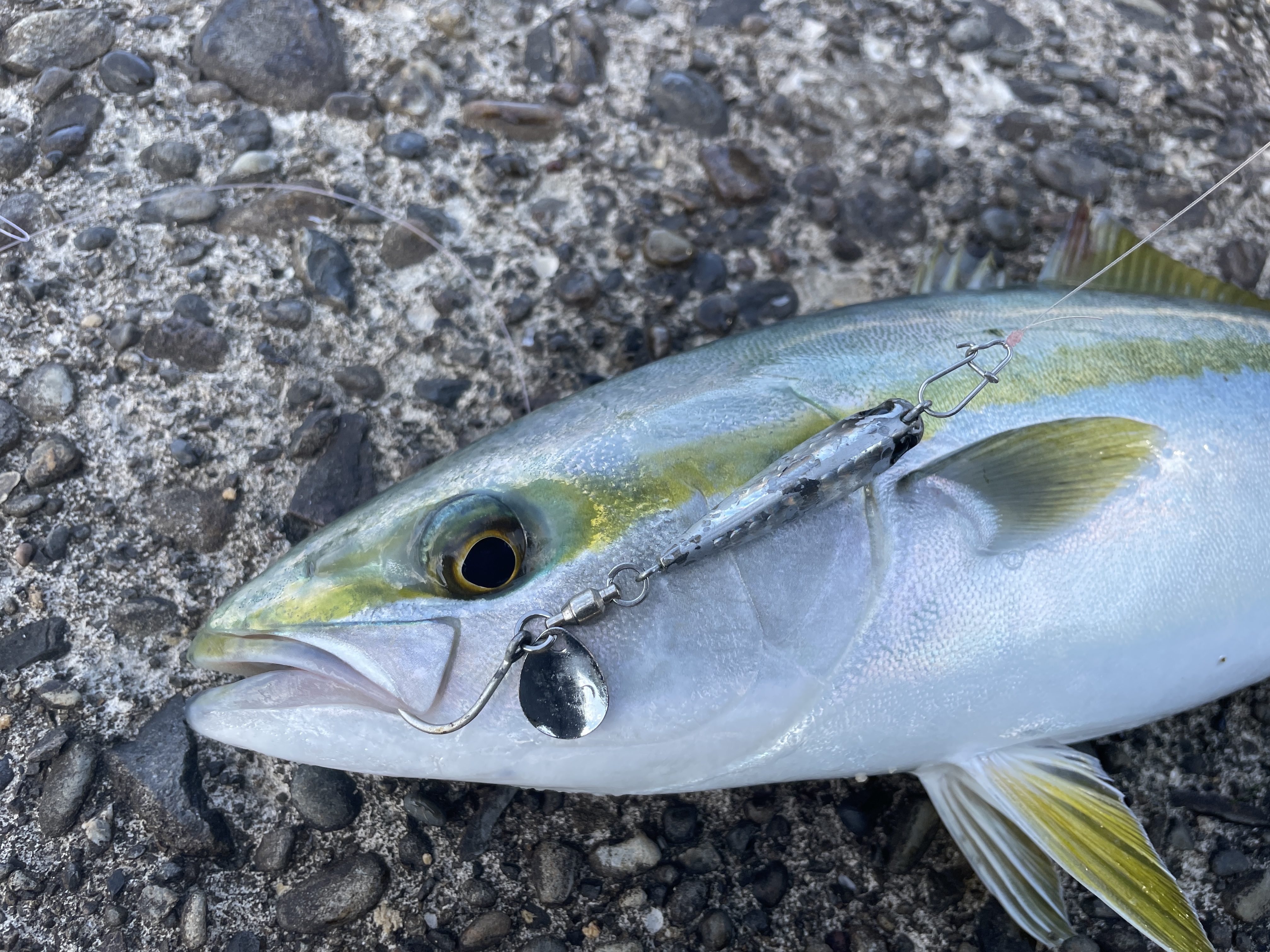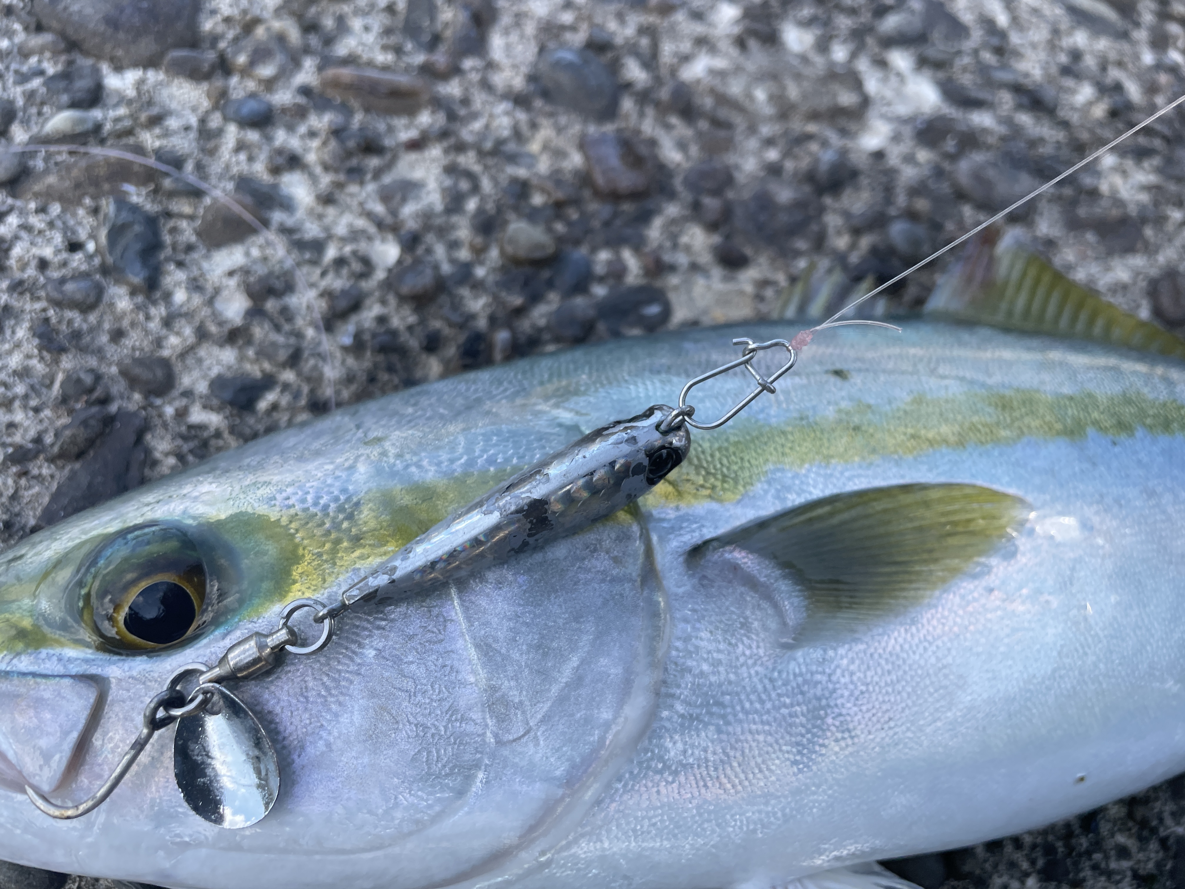 マイクロベイトを捕食している時はブレードジグが強いです。しかし、ナブラが全く寄ってこないので底まで沈めてゆっくり中層まで巻いてくるとゴンッとアタリが。なんなく寄せてランディング。40cmくらいのハマチでした。