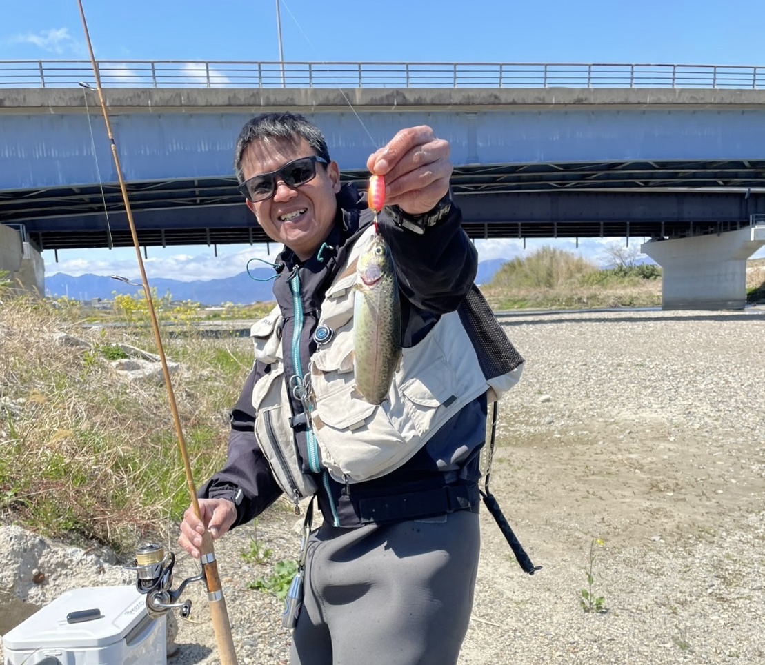 フィッシング遊桑名店から10分ほどの員弁川放流イベントに行ってきました!10時半ごろ魚がたくさん放流されて釣り開始!ARスピナーやチヌークをローテーションさせますがなかなか釣れずすると同行した店長がスミスのピュアでヒット!キャッチ!!釣り方を教えてもらい狙っているとあたりはあるもののなかなかのせきれず苦戦。大きめのチヌーク7グラムに変えて遠投して巻いているとようやくヒット!キャッチできました!去年のリベンジが達成できて大満足の釣行となりました!短時間釣行でしたが4人で10匹釣れました!