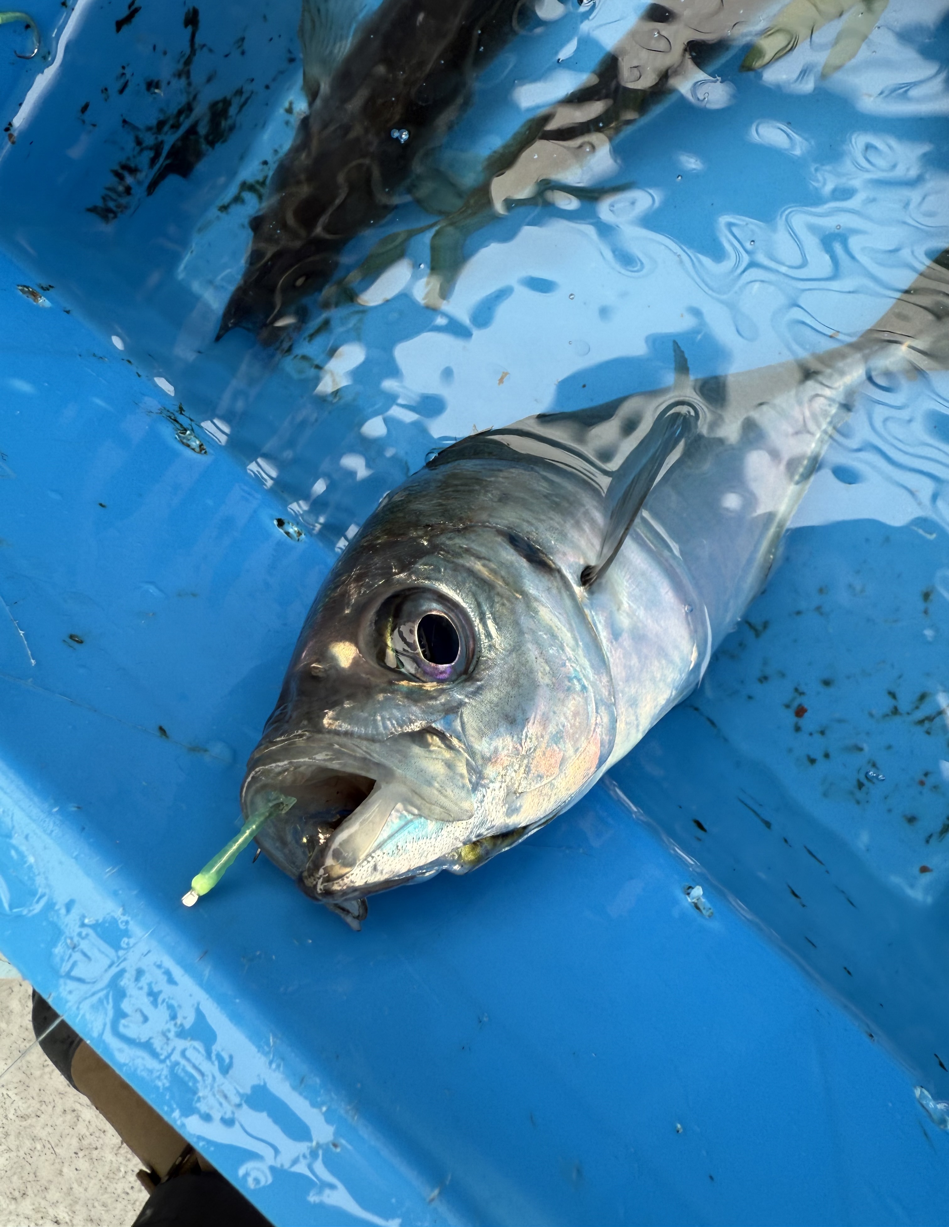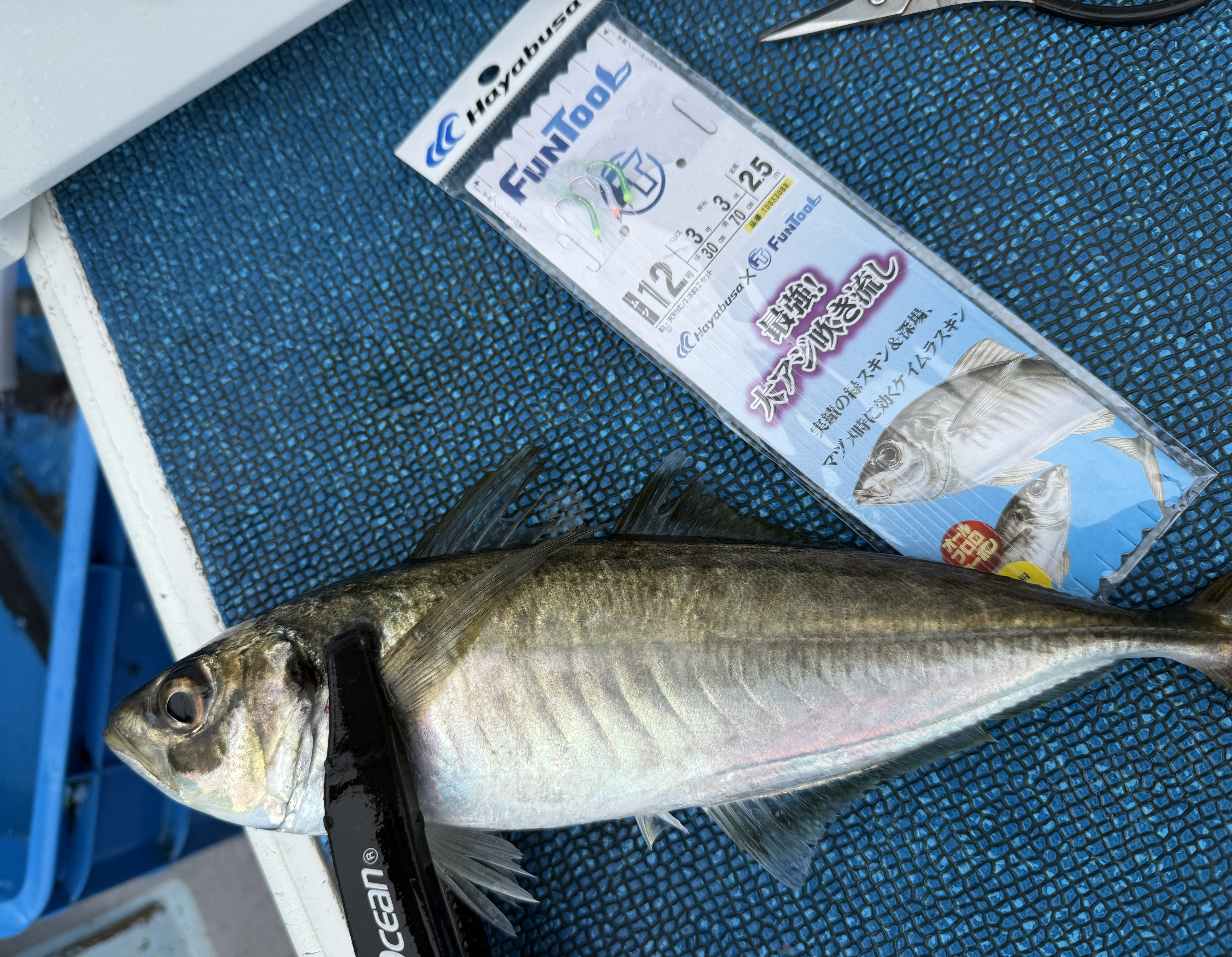 国崎の勝丸さんへ夢の大アジを狙いに遊メンバーと行ってきました!なんとジャンケンで負けたのに右舷のトモへ釣り座を構えることができました。仕掛けはファンツールの最強アジ吹き流し仕掛け!緑スキン2つとケイムラ1つが混ざっている仕掛けなのでパターンを確認するにはもってこいの!ポイントは深いエリアは60m台、他は40m台。船長のコールは下から4〜5mを狙ってのことなので当たりがなければプラマイ1.5mほどワイドに狙っていきました。釣り座も良かったこともあり47センチを頭に20匹ほど釣り上げることができました。アタリは仕掛けの緑スキンの針に集中。やはり緑スキンは偉大です。しかしこんなに分厚くて大きなアジが釣れるとは、、、びっくりです。