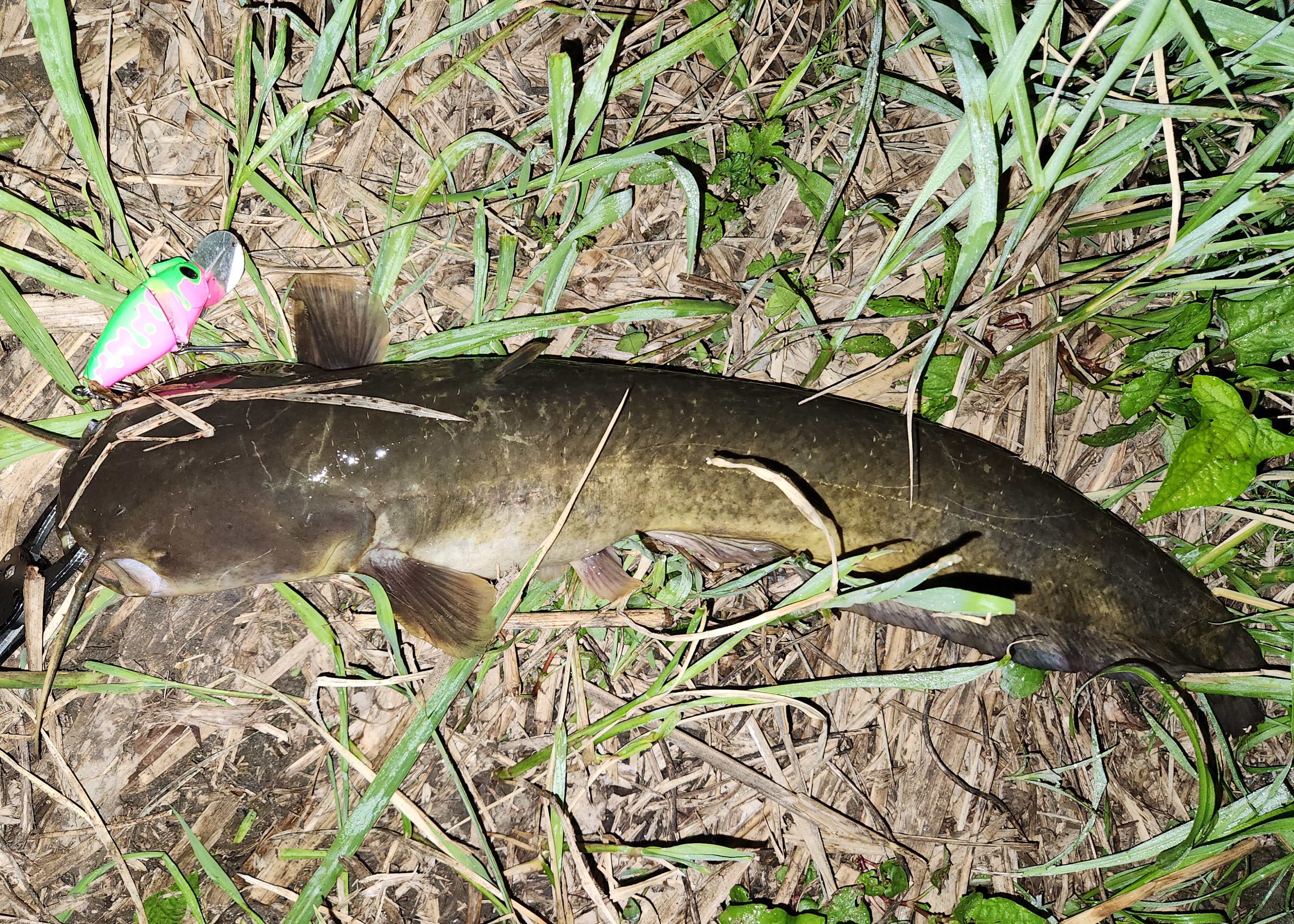 ということでナマズ釣りへ!雨後じゃないのでどうかなと思ったのですがしばらくするとナマズのバイト!これこれ!と思いながら続けるとヒット!ランディングどうしようかなー抜けるかなーって迷っていたらバラシ…
