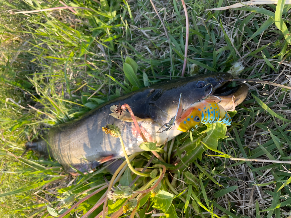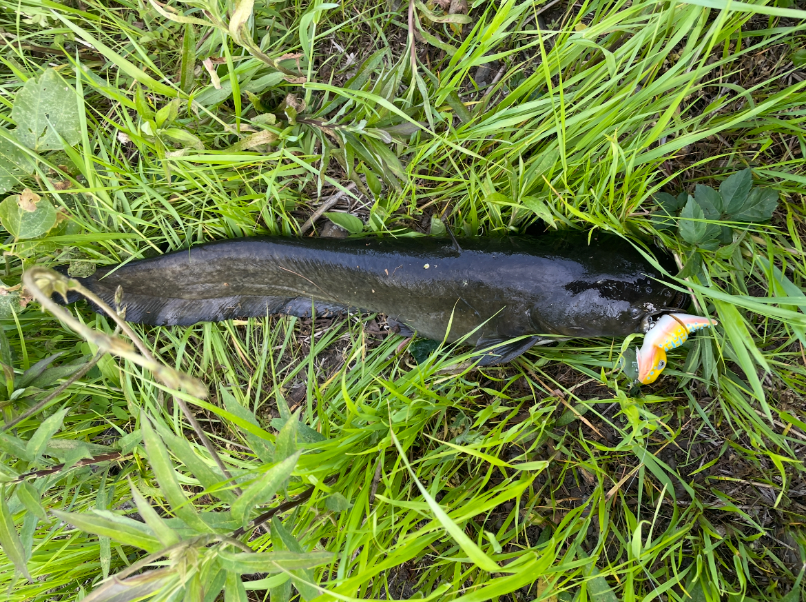 ポイント到着後ナマズがいっぱい見えますが、なかなか食わせられません。歩きながら足元の草の脇にルアーを落とすと草陰に隠れていたナマズがバイト!一本目キャッチ♪その後、見えナマズに何度もキャストしていると横から出て来たナマズが何度も何度もミスバイト!ようやくフッキングさせて2本目で終了しました!