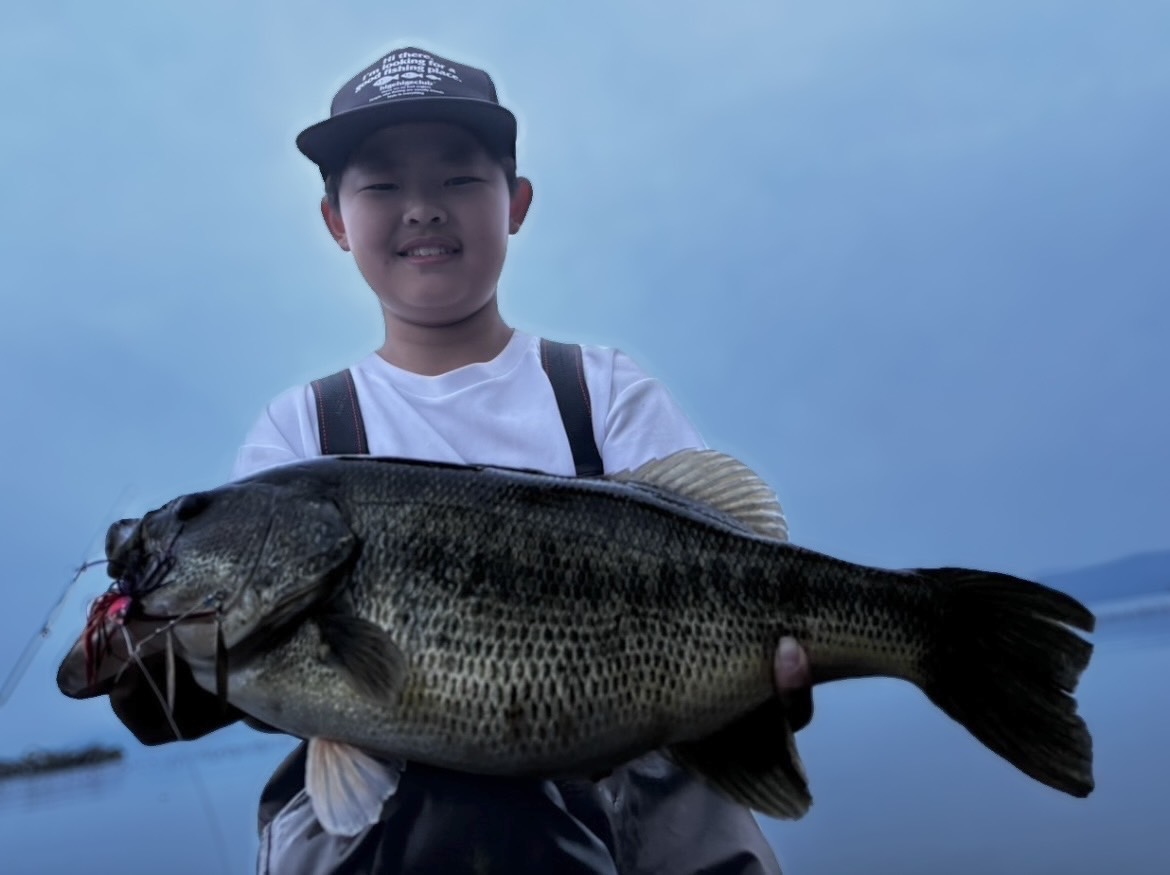 入りたいポイントは既に人だらけ…少しズレたポイントに入ります!当たりもなく夕まづめ 、「食った!」と長男の声が!見えない所でやってたので状況分からず、とりあえず慌てて長男の元へ!1人でランディングして琵琶湖初バスキャッチしてました✨サイズ測る前に暴れて逃げられてしまったのでサイズは測れず…45upは確実50はギリないぐらいでした!ウェイトも測りたかったなぁーごめんよ。息子。