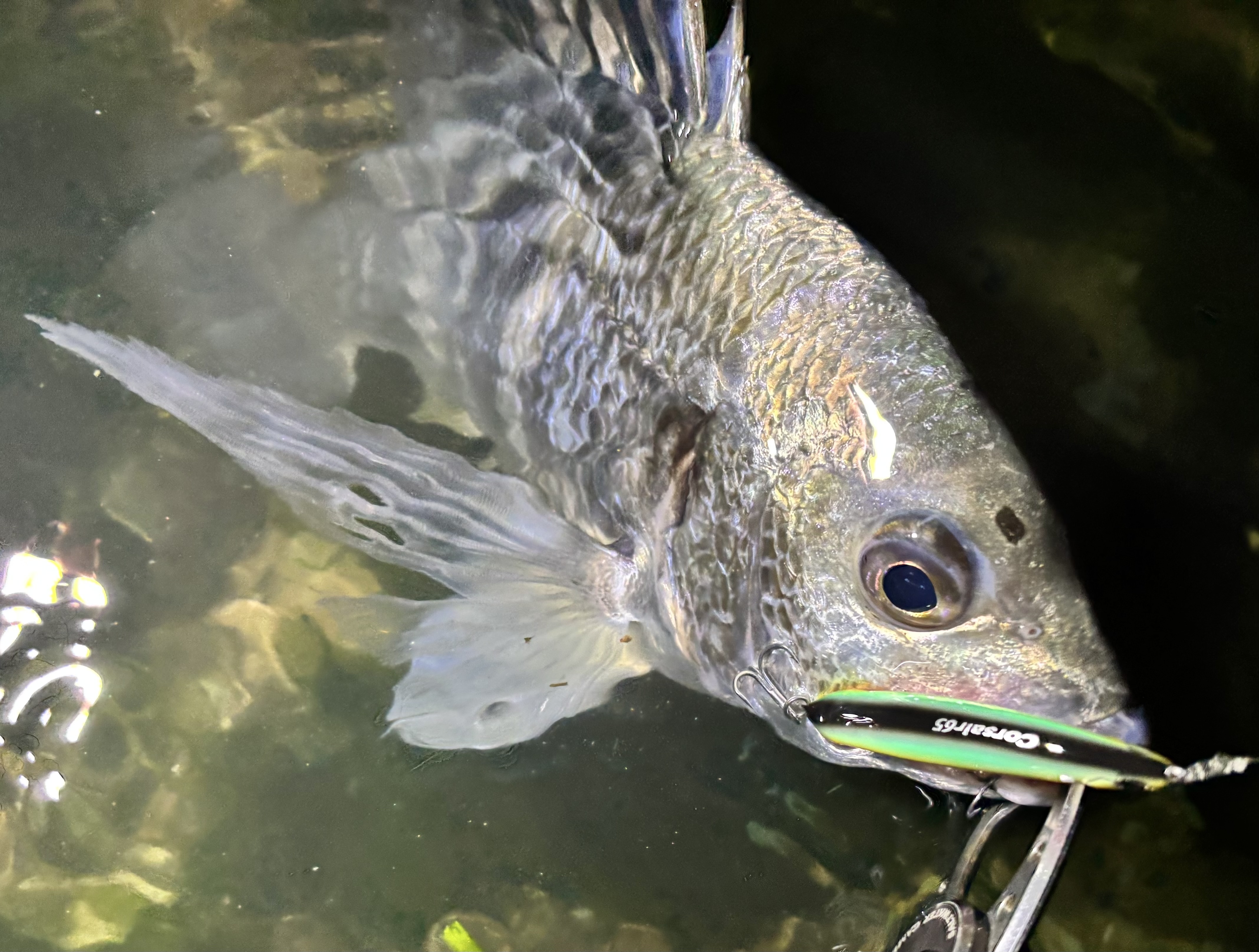 雨の影響でバチが減っていないか心配でしたが、しっかり抜けていました。そんなわけで連日釣果が出ているコルセア65ボーンモデル、シークレット赤バチでスタート。