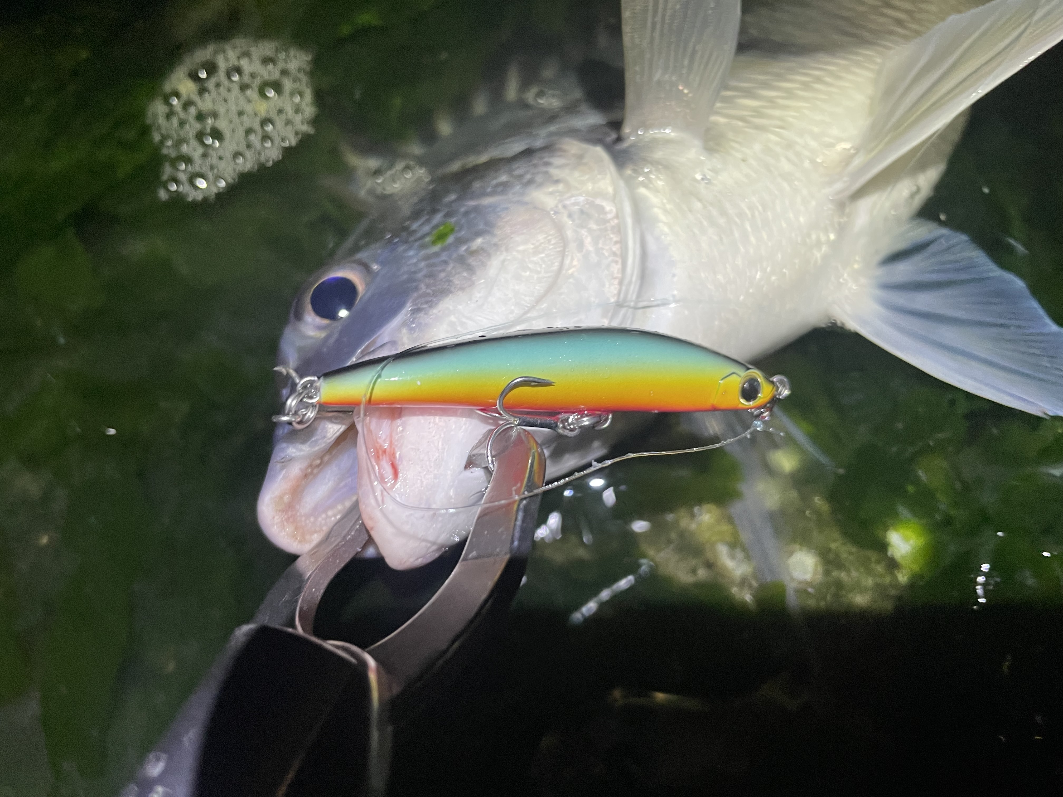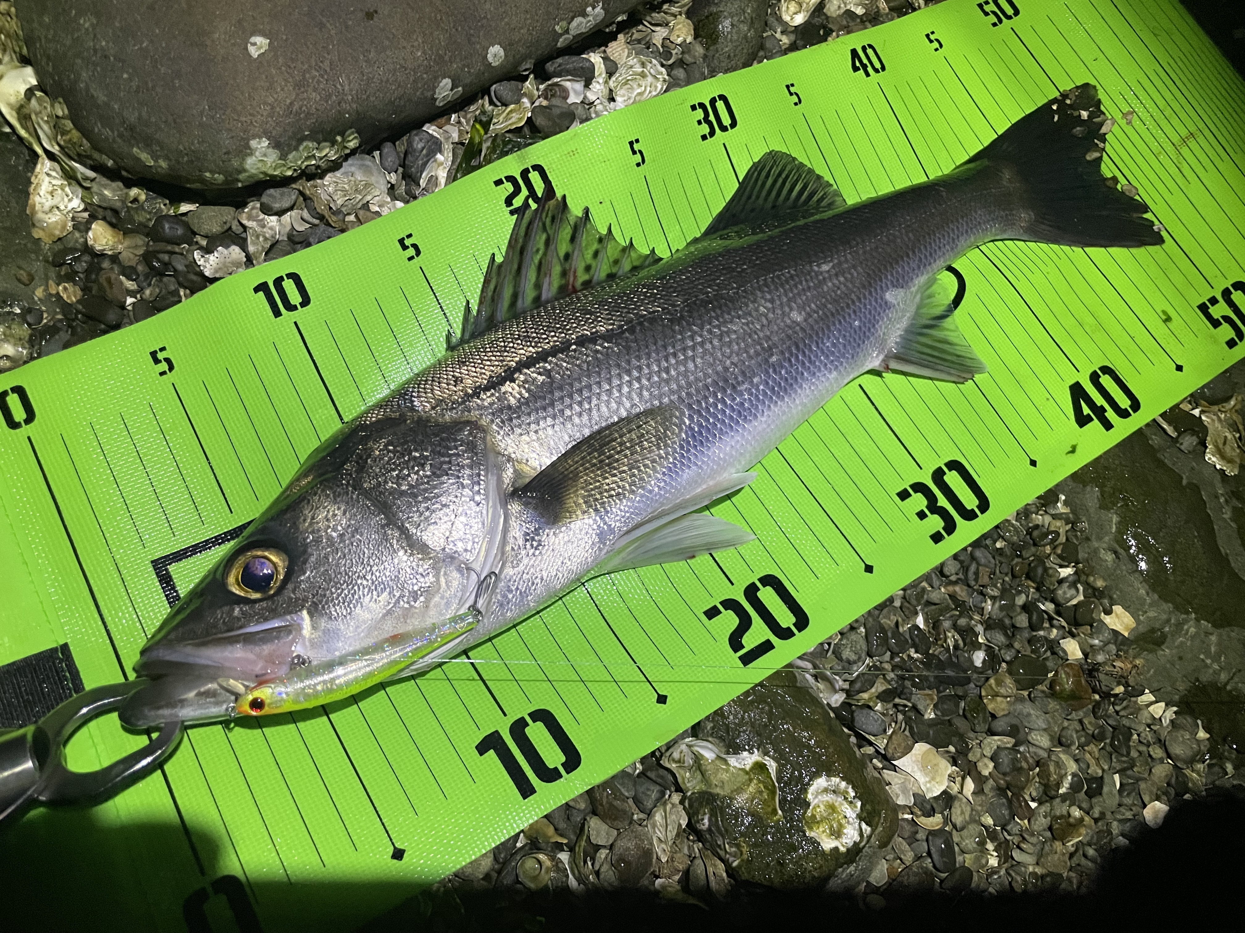 結果!本当でした!良型キビレ2枚キャッチ!他のカラーも投げましたがアタリがあったのはこのカラーだけでした!システムミノー7Fでもシーバスが釣れました!