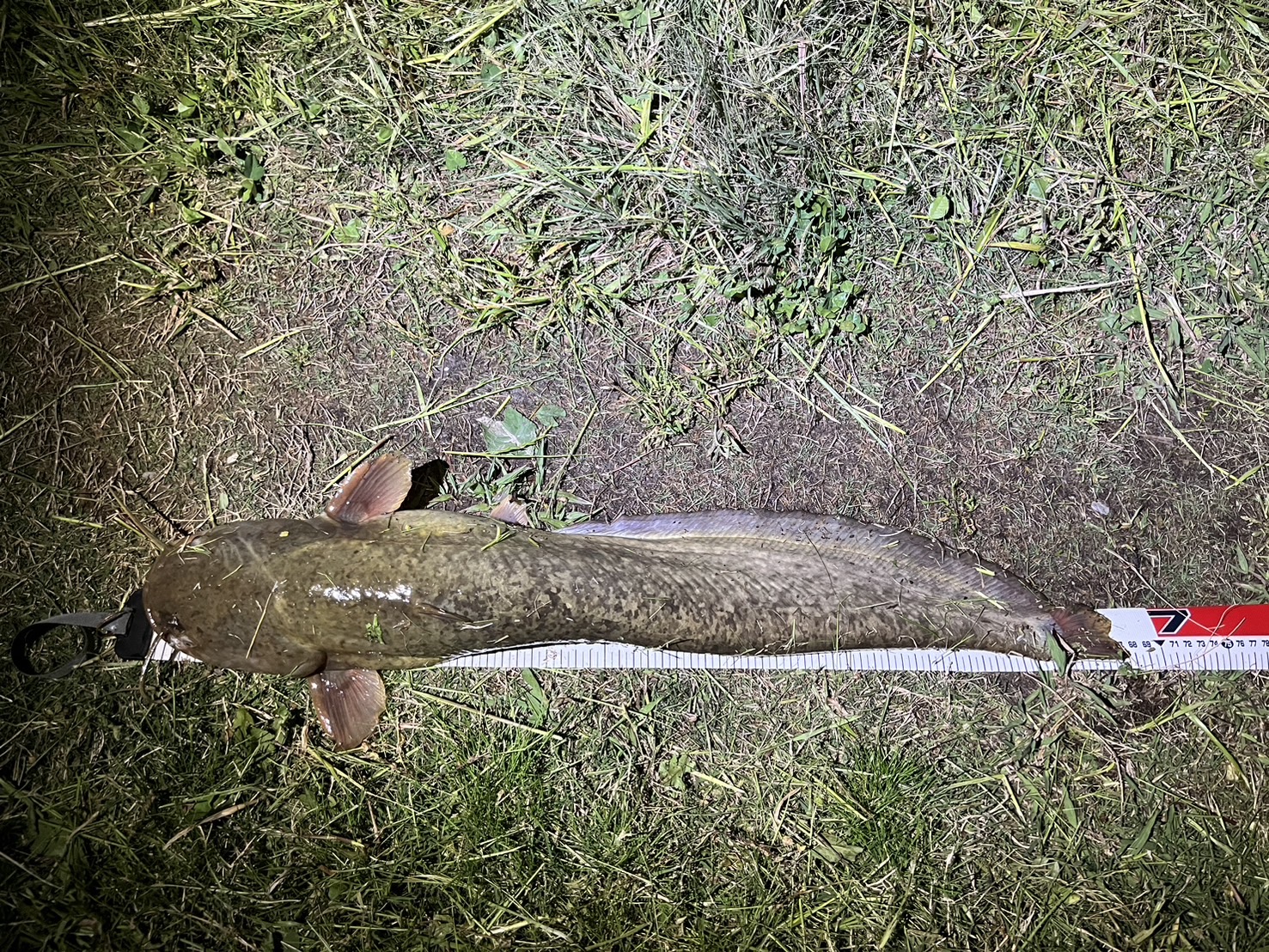 流れ込みにキャストし、スローで巻いてくると、水面が爆発!しかし1回目は乗らず。そのまま巻き続けるとまたでました!巻き続けて竿に重みを感じた瞬間にアワセを入れるとヒット!あげてくると67cmのナマズ!
