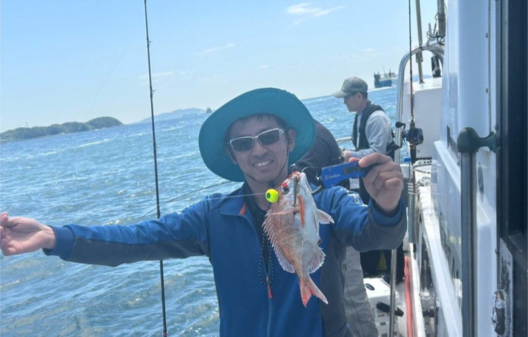 タイラバは45〜80グラムを使用します。ワームはできるだけ小さい目がオススメ。海毛虫1、8やあいや~タコカーリーJrが船長のオススメでした。ワームカラーは状況に応じて変更しますが、オレンジ系がよく当たりました。結果として、マダイは2枚だけでしたが、船中28枚、5枚釣られた方がいましたが、アタリの数はその4倍は出ています。いかにアタリを取って掛けるかがテクニカルで、なかなかもどかしくおもしろい!