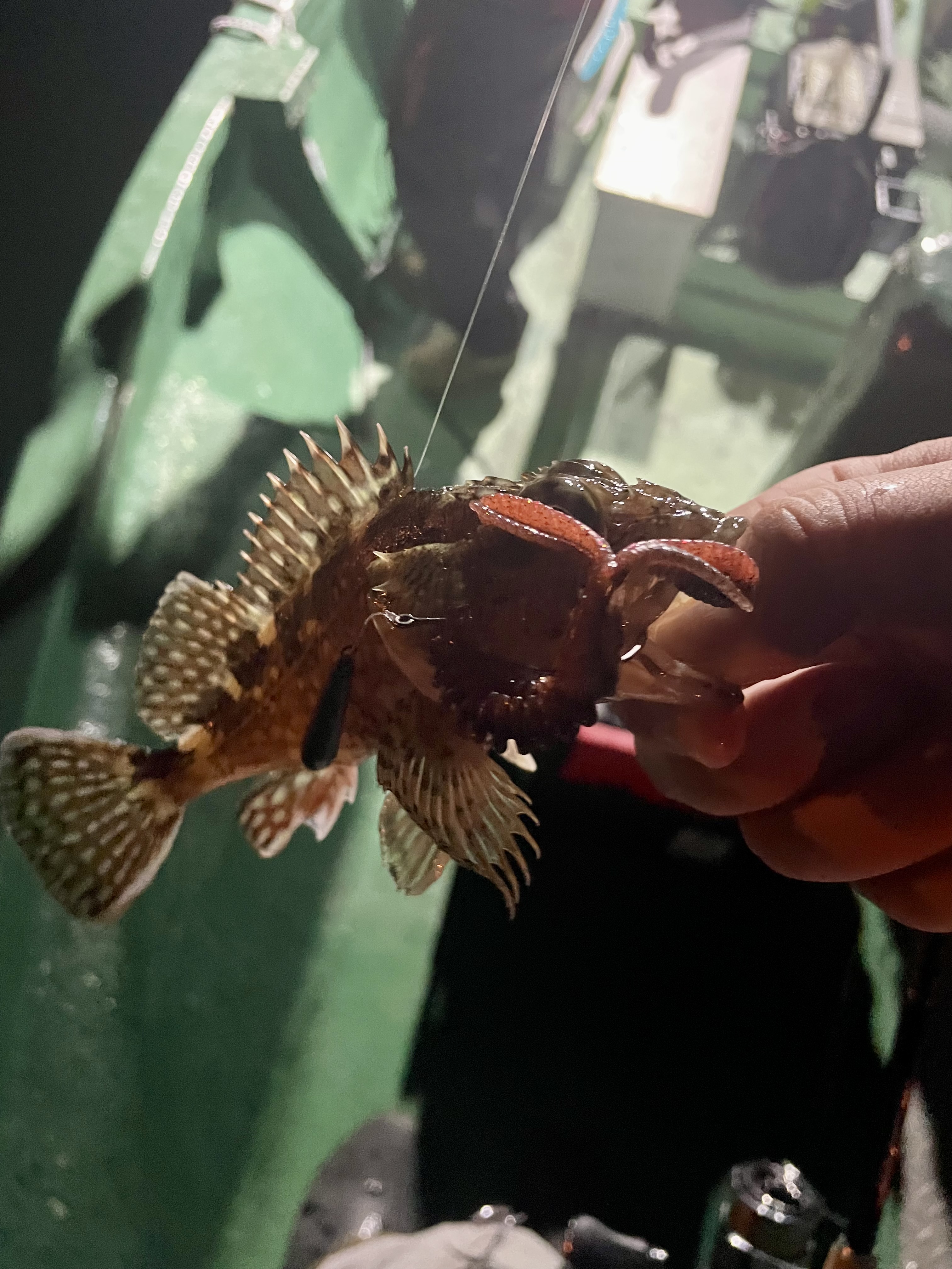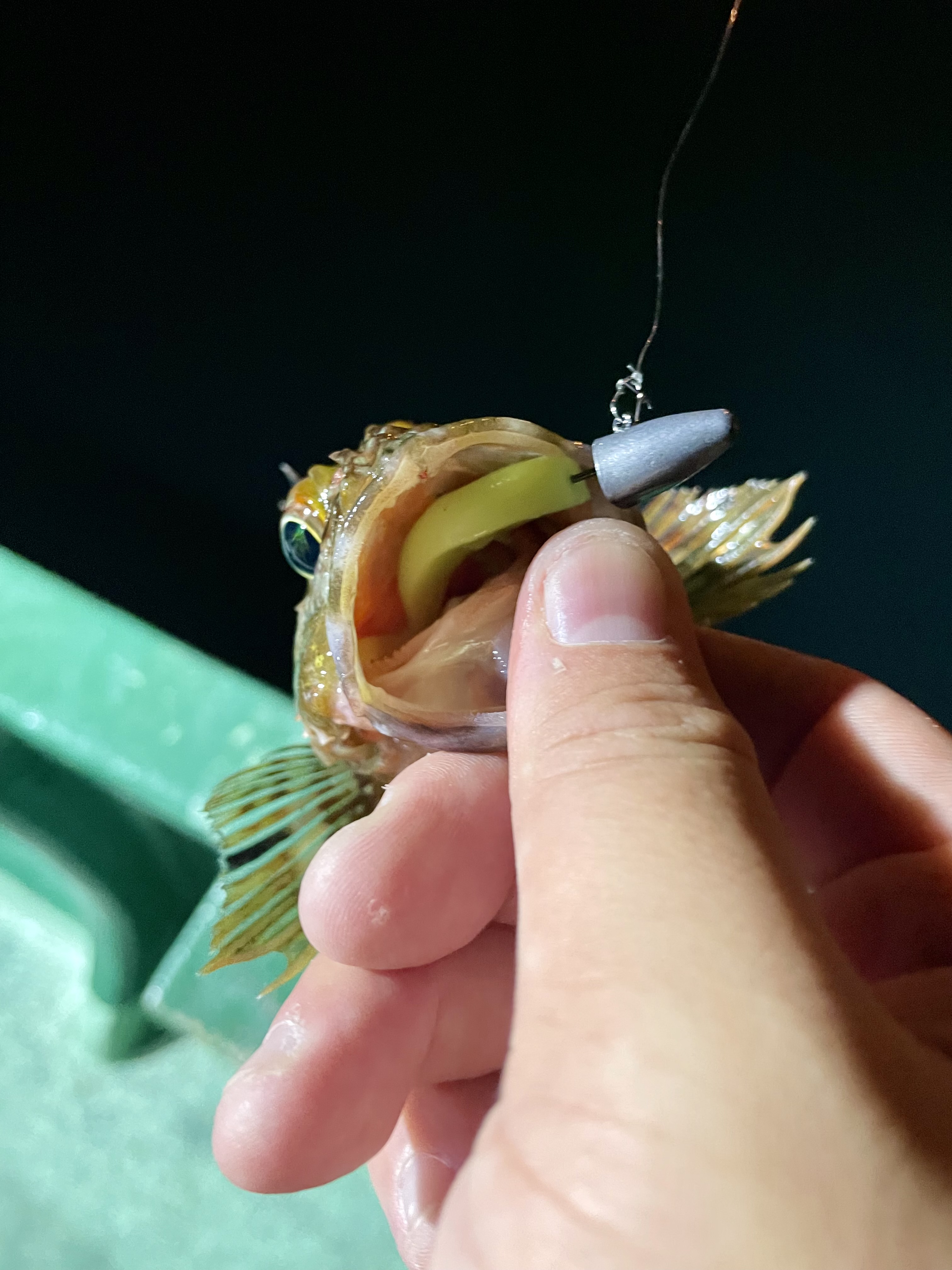 カサゴはドリームアップのDDヘッドの6gにダート8の2.5インチのカラーはクリアチャートを使用しました。フリーリグの7gにワームはジャコバグの2.6インチでも爆釣でした。