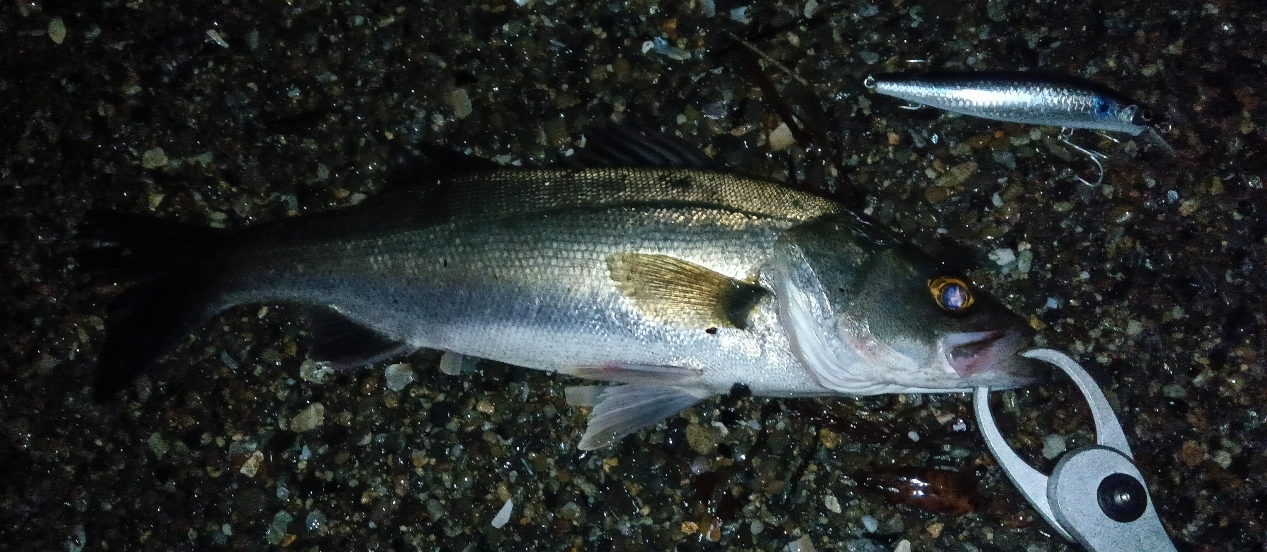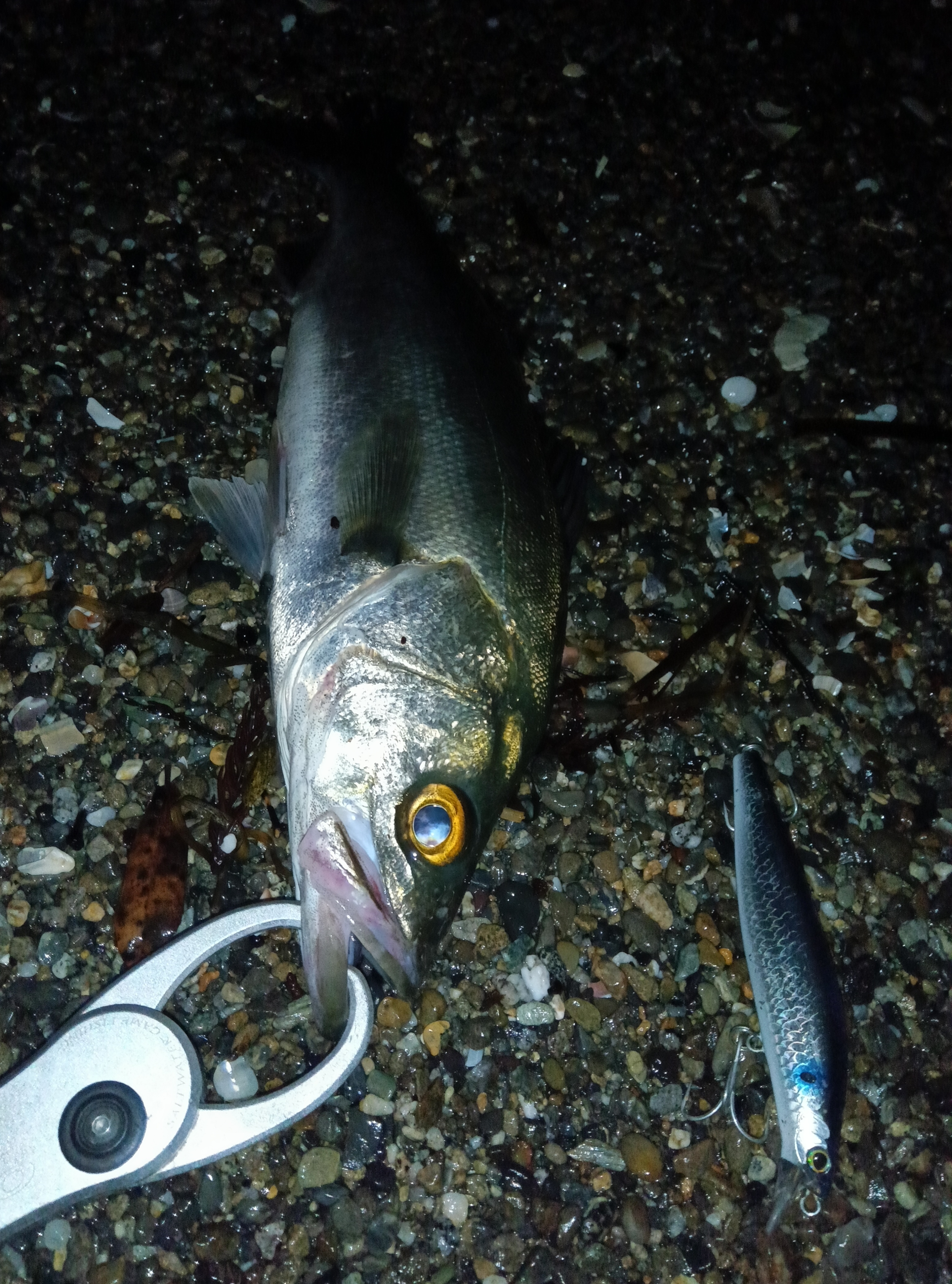 そのうちようやく1アタリ。おぉ?しばらくして掛けましたが、あえなくバラシ。跳ねなかったのと手応えからたぶんマゴチ。いるじゃないの、とさらに投げ続け、またアタリ。今度はフッキング成功。上がってきたのはシーバス。暖かくなってきたのか、エラ洗い連発。楽しい!
