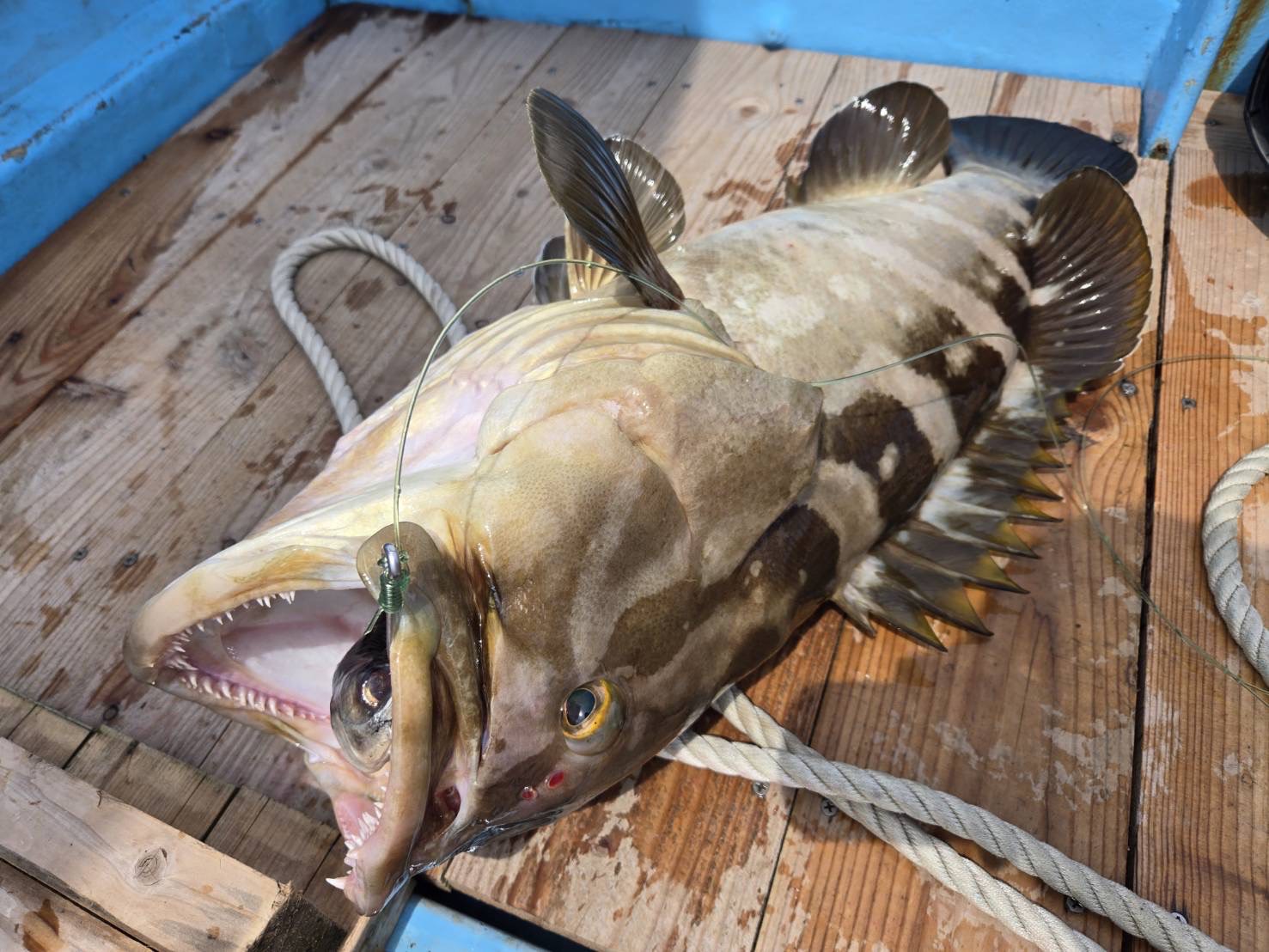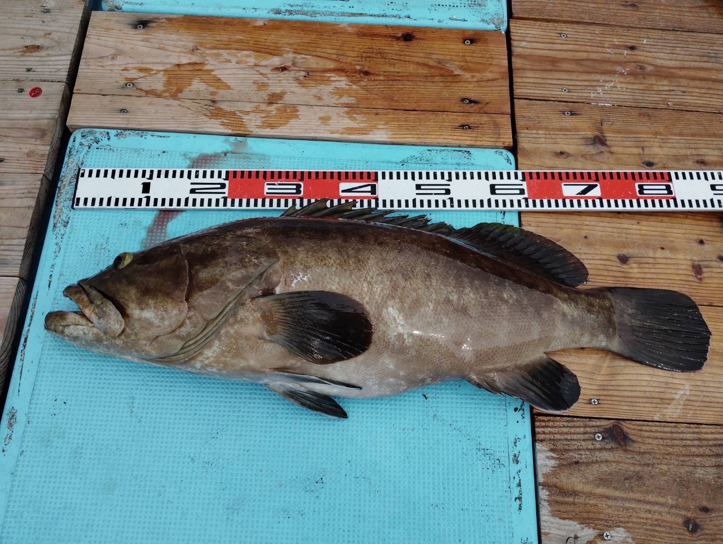 根に潜られないように必死にゴリ巻きし、水面に上がってきた魚は本命のクエでした!