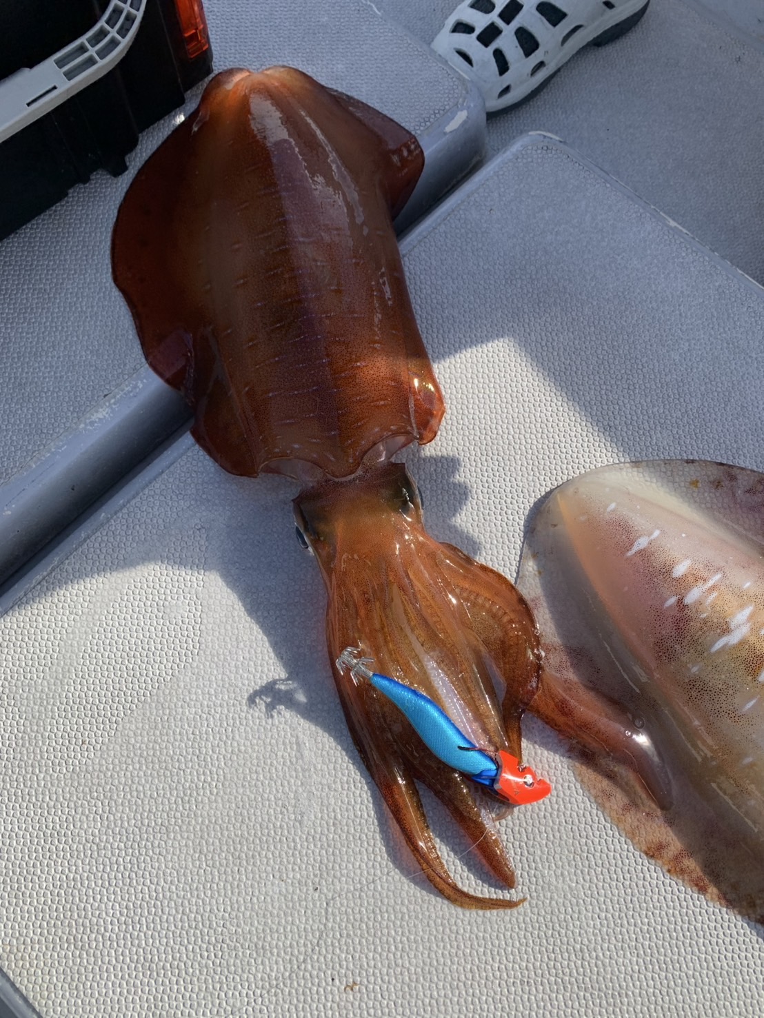 今年は潮周りを見て最高な日を確保しました笑前日も3キロアップ2本上がっていて期待していますが毎年初日めは厳しい感じ笑沖縄のヤザワ船はドテラ流しではなくバーチカルの釣りなので真下でやっていく感じです!水深は50メーターから80メーターでやりました。ヘッドシンカーは50gから100gあると良いです!エギはアピール強いのがオススメと教えて頂き!キーストンデイブレイク4号をチョイス!ヘッドシンカーは60gを使いました!ポイントへつき一流し目でヒット❗️1.5キロぐらいでした。当たりの日かと思いましたが最後まで当たらなく厳しい一日でしたが知り合いが3.5キロ釣れていました!