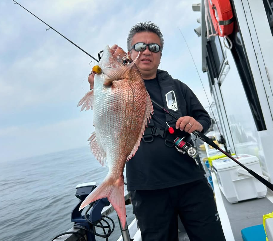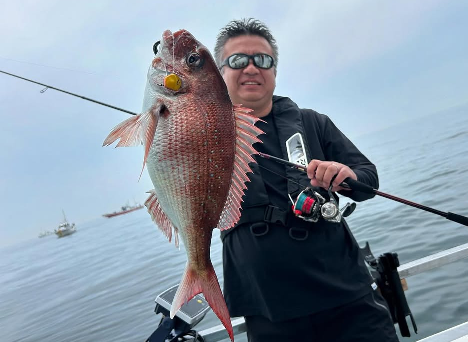 話題になりつつある「一つテンヤマダイ」に行ってきました。お世話になったのは片名漁港出船「忠栄丸」さん。今回はハヤブサさんと一緒に釣行してきました。ポイントまでは30分程。伊良湖沖の水深50m~40m。ちょうど満潮からの下げ潮。潮の動きが緩かったので8号からスタート。エサは活きウタセエビ。釣り方は、底取りして2回シャクリ上げしてゆっくりテンションフォールの繰り返し。しばらくして待望のアタリからヒットしたのは40cmほどのマダイでした。その後は底潮が速くなりテンヤを12号に交換。同じようにシャクリ上げからのテンションフォールで連発!!サイズは同じようなサイズ♬話題の一つテンヤマダイ!今後盛り上がりそうです!!