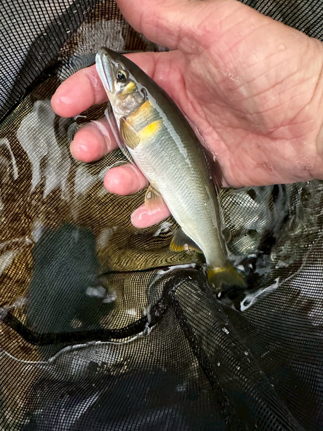 また、なんとシーズン前の鮎が川虫に食ってきて釣れてしまいました。瀬の中で黄色い追星クッキリの17センチほどの鮎でした。まだ5月なのに良型でコンディションの良い鮎でした。