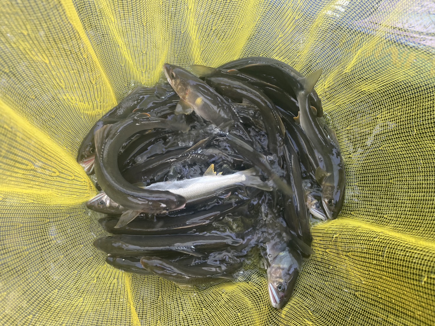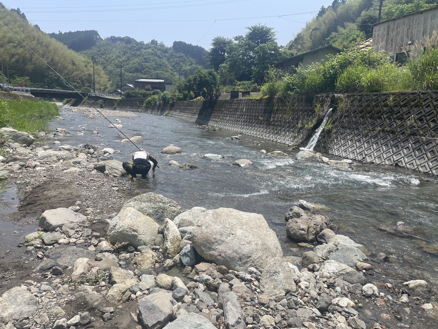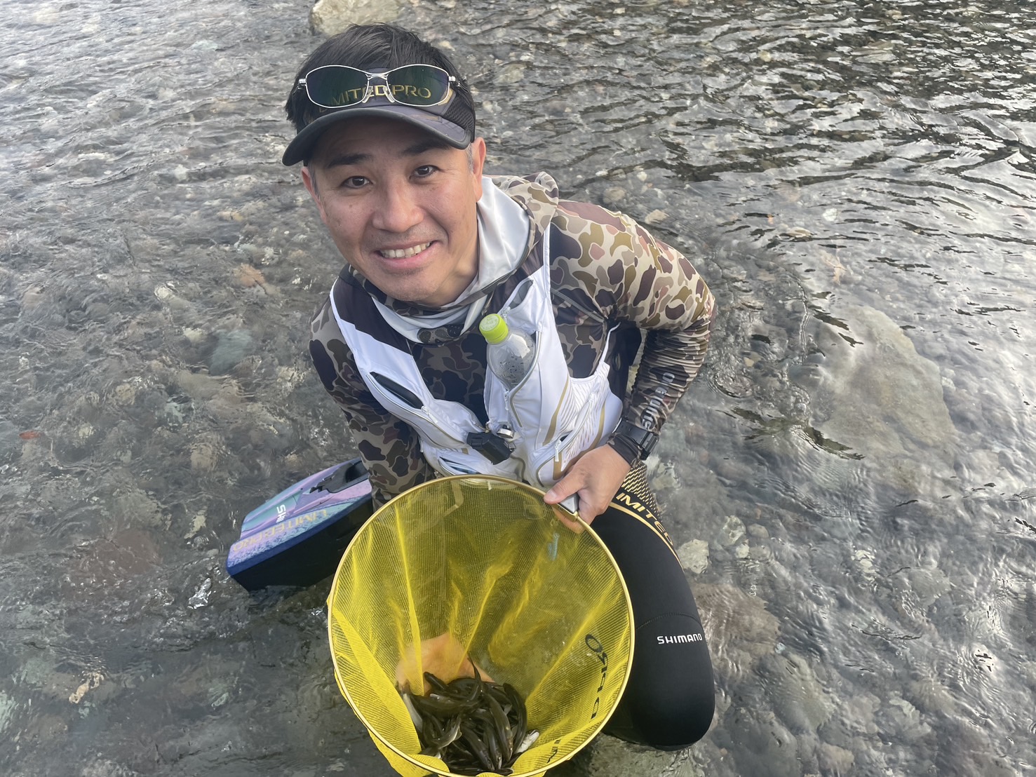 こんにちは~焼津街道店の三浦です。5月20日解禁日の興津川に鮎釣りに行ってきました。当日は遅めの8時30分に当店の新田チーフと待ち合わせをして出発。オトリ屋さんには9時30過ぎには到着。解禁日ということでオトリ屋さんも賑わっていました。オトリと日釣り券を購入し、ポイントを見て回るも本流は先日の増水の影響で垢が飛んでいて厳しそう。支流で垢が残っていそうなポイントは人でいっぱい。最上流まで見て回りますがどこも厳しそう。引き返して下流向かって走っていると、人のいない支流を発見し、橋の上からみると、垢が残っていたので、ポイントは狭いですが着替えてやってみることに。10時15分ころから釣りをはじめて開始すぐに掛かりますが、掛かりどころが悪く空中でバラシ。その後も同じポイントで掛かるも群れ鮎なのかバラシが多い。開始1時間程で6匹。その後もポツポツ掛かり13時までに9匹追加し約3時間で15匹の釣果。遅めの昼食を食べて釣り再開。午後から同じポイントを釣るもペースダウンして17時まで楽しみ12匹追加して27匹の釣果でした。本流は垢が10~20%しか残っておらず回復にはもう少しかかりそうです。22日も雨予報ですが50㎝くらいの増水であれば週明けには楽しい釣りができると思います。