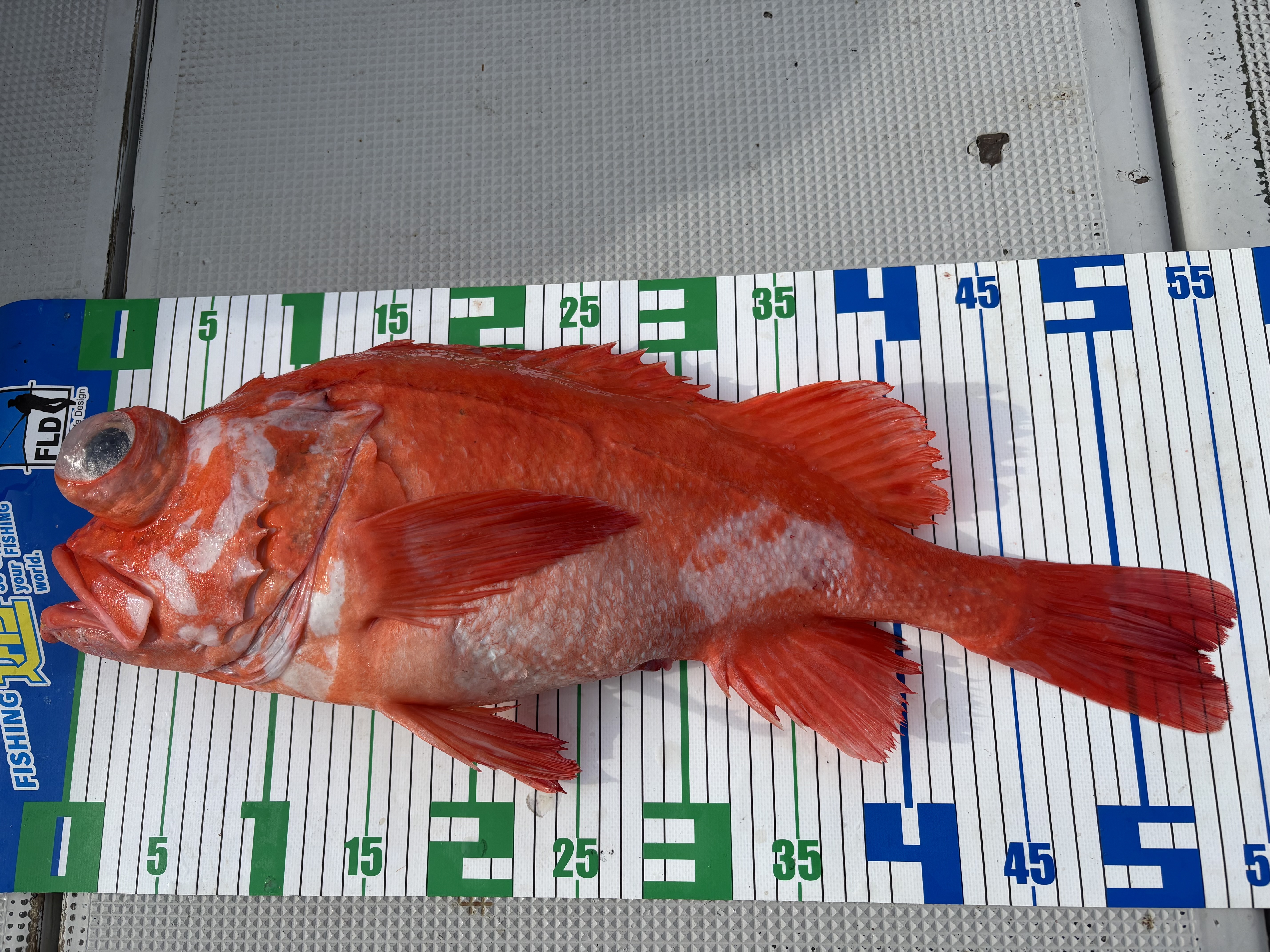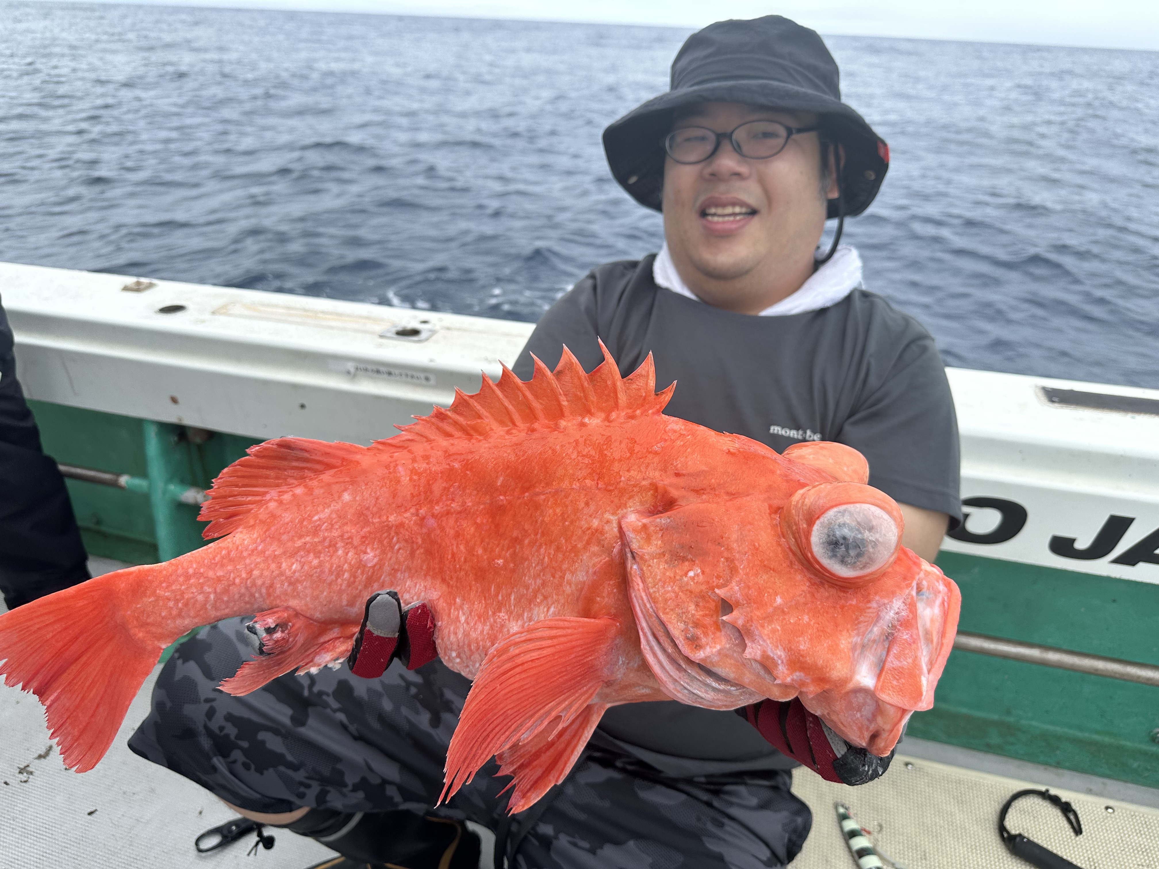 あいにくの雨予報の中での出船となりました中深海ジギング♪お世話になったのは当店より一番近い出船場所のMSマリンさん!4時に集合してポイントまで3時間弱のクルージングです。ポイントは水深250m~300m位をやっていきます。ポイントにつきいきなり当店店長岩木にヒット!上がってきたのは海のダイヤ、アカムツ!これには船長もビックリ!今シーズン初らしいです♪自分もと思っていると何やら重い(笑)とりあえずあげてみると掛かっていたのはアヤメカサゴ♪一匹釣れてホッとしていると今度はまたしても店長の竿がブチ曲がっています♪これは思っていると今度はきれいなマダイ♪本当に何が掛かってくるか解らないですね。落とす度に当たっていましたが少しポイント移動。船長が350mとのアナウンス♪ジグの着底にも少し時間が掛かっていましたが上潮も下潮もそこまでだったのと、底から3mくらいまでが勝負なので対空時間の長いクランキーの350gを使いました♪このチョイスが大正解でした♪着底してから1/4ジャークでフォールしている所にヒット!メチャクチャ重い!!!!生命感よりもとにかく重い!水深は350m、鈍重な引きにとにかく重さがすごい!悪戦苦闘しながらようやく後一色、魚体を見たときに船長の開口一番「なんだこれ!?」もちろん自分もです(笑)後々で調べてみるとこちらも高級魚のアコウでした♪サイズも55cmと特大サイズ♪本当に何が掛かってくるか解らないですね。このポイントのポテンシャルは本当にすごく、店長がこのポイントで50cmオーバーの黒ムツ!黒ムツってこんなに大きくなるんですね(笑)自分も釣りたいなと思っているとフォールからのまた違うアタリ!アコウほどではないですが重い(笑)上がってきたのは40cm超えるくらいの黒ムツ!目標の魚を釣れて大満足!当店柴田は幻の魚、アラ、オニカサゴなど大爆釣!三者三様で大満足の結果となりました!また中深海ジギングにはまりそうです♪
