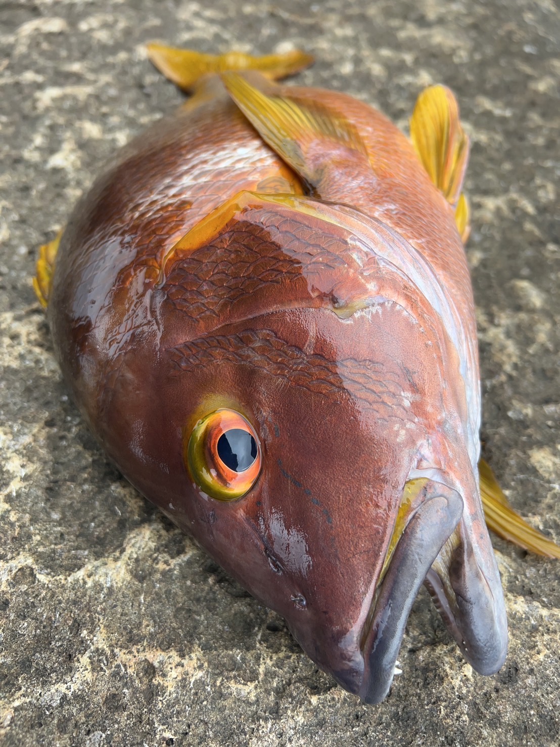 竿を立てると猛スピードで磯際に突っ込んで行きます!強烈な引きに耐えて上がってきたのは53センチのシブダイ!!