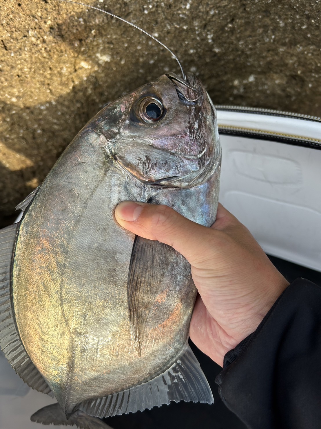 朝イチは潮がよく流れていたので遠投して流していくと40センチほどのオキアジゲット!