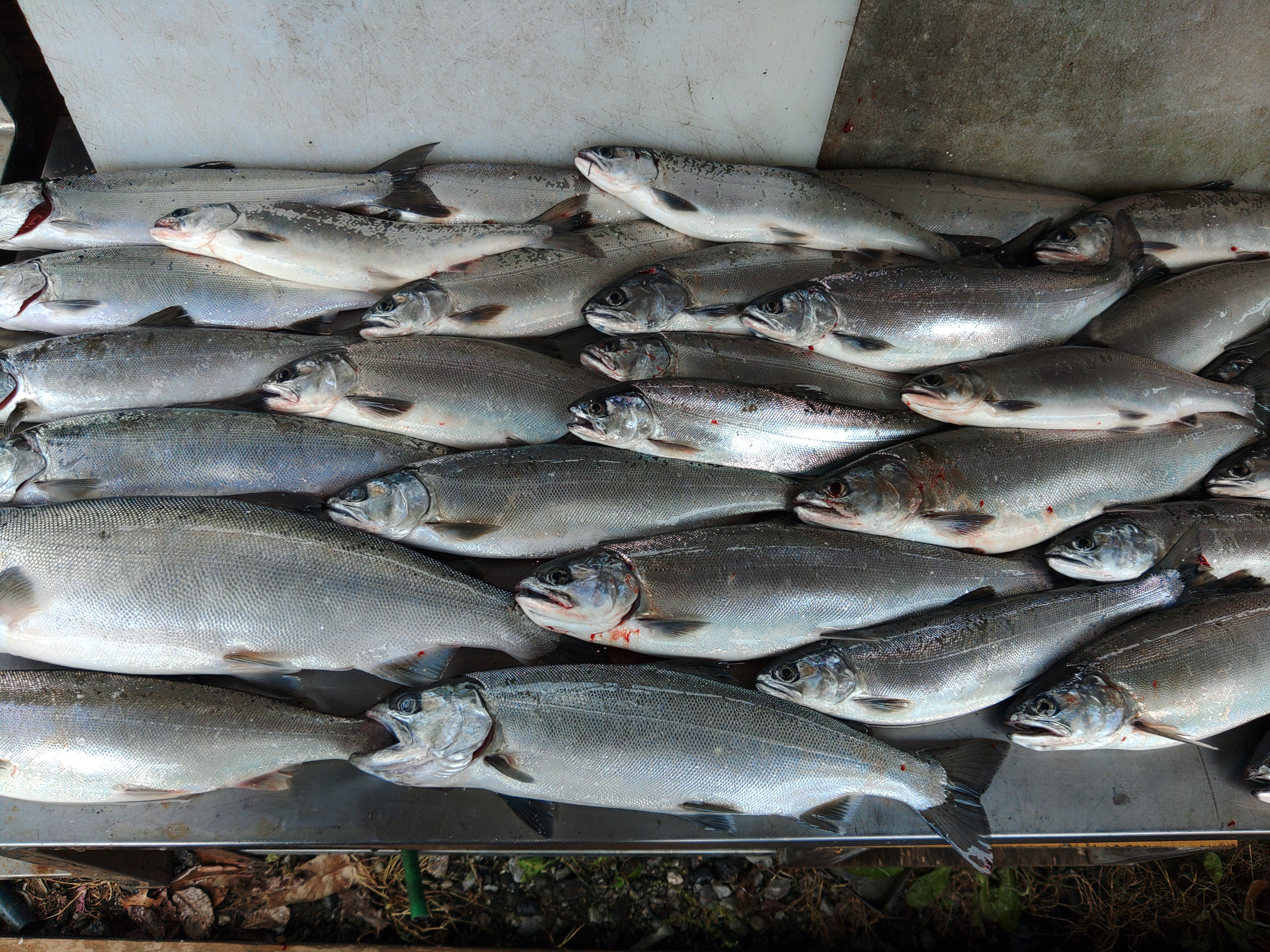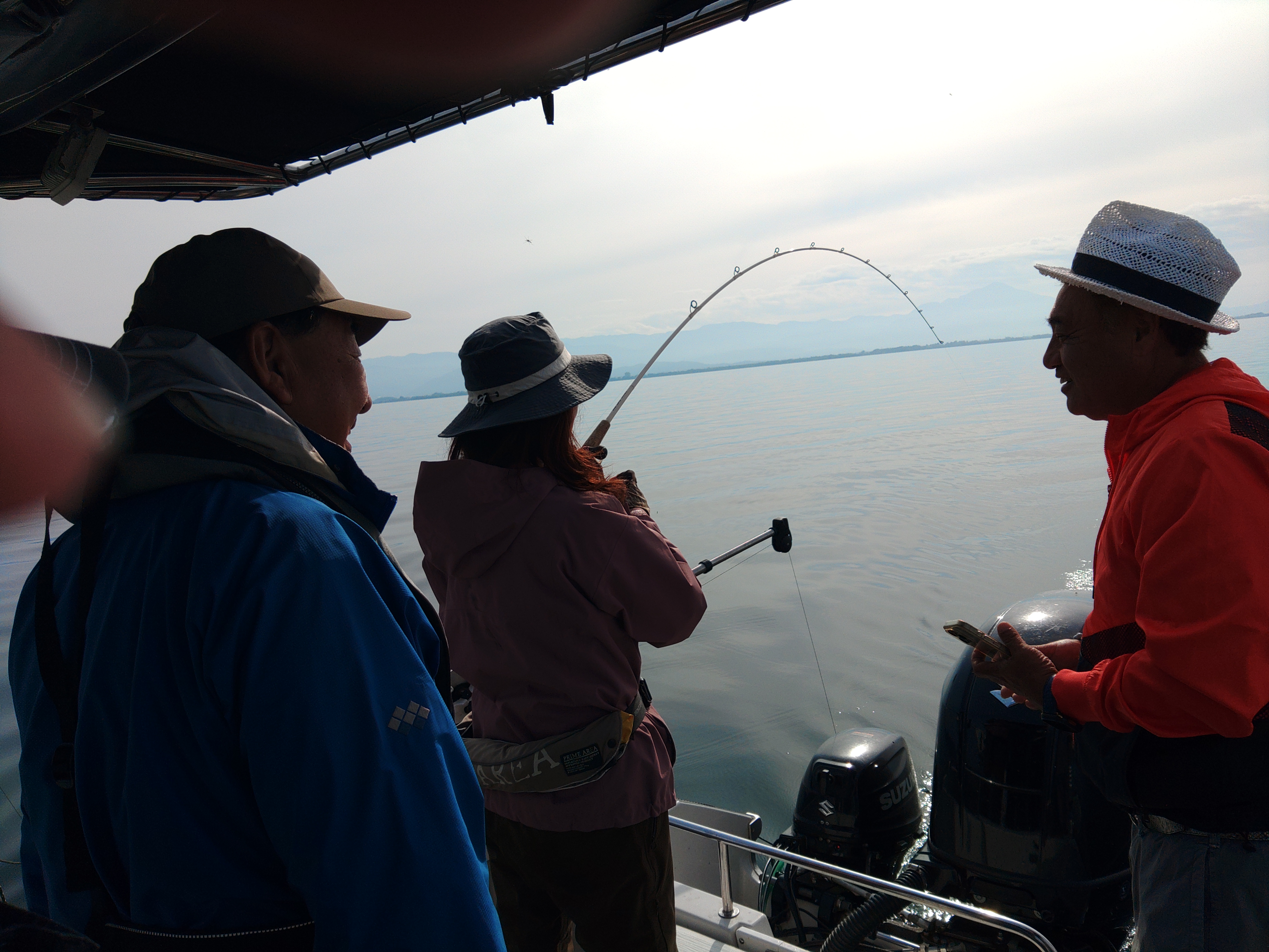 雨も上がり少し肌寒いが風もなく穏やかな天気となりました。 スタートして15分ほどで竿にアタリがあり、釣り上がって来たのは30㎝ぐらいのビワマス。サイズは小ぶりだがまずまずの出だし。 その後もポツポツと釣れるものサイズが伸びず、PM12:00までに50匹以上釣ることができ、途中で小さいサイズはリリースしながらも53㎝を頭に30~45㎝を6人で30匹キープすることができました。