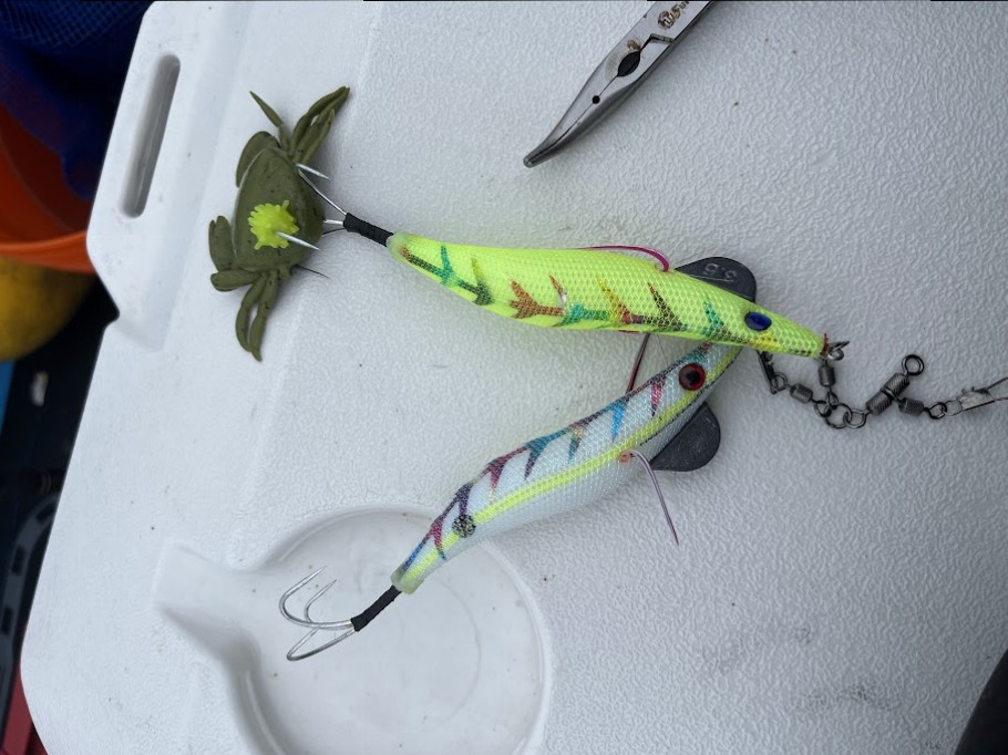 今回は楠漁港出船の釣船長谷川様にお世話になりタコ釣りに行ってきました!タックルはロッドがアルファタックルの海人エギタコ180H、リールがテイルウォークのオクトパスライトプラス66RにPE3号でチャレンジ!また明石の方では定番のマルキューのパワークラブBIGも隠し玉として準備しました!開始早々に近くの船でタコが上がっていてテンションUP!自分もとオモリを底から放さないようにシェイク!ひたすらし続けるとモゾっとアタリが!待望の一匹目!そこから誘い続けてもう一杯!もっと釣れるかと思いましたがそううまくはいかず…全体的にアタリもなくなってきたところで大物狙いのポイントに移動!期待しながら狙い続けるもあたりはなく終了しました。帰ってきてから処理をしてから揚げとタコ焼きにしましたが絶品!タコはおいしくていいですね!まだまだつれてくると思いますのでぜひ行ってみてください!あ、よく釣っている方はハピソンのハピタコつけてました。