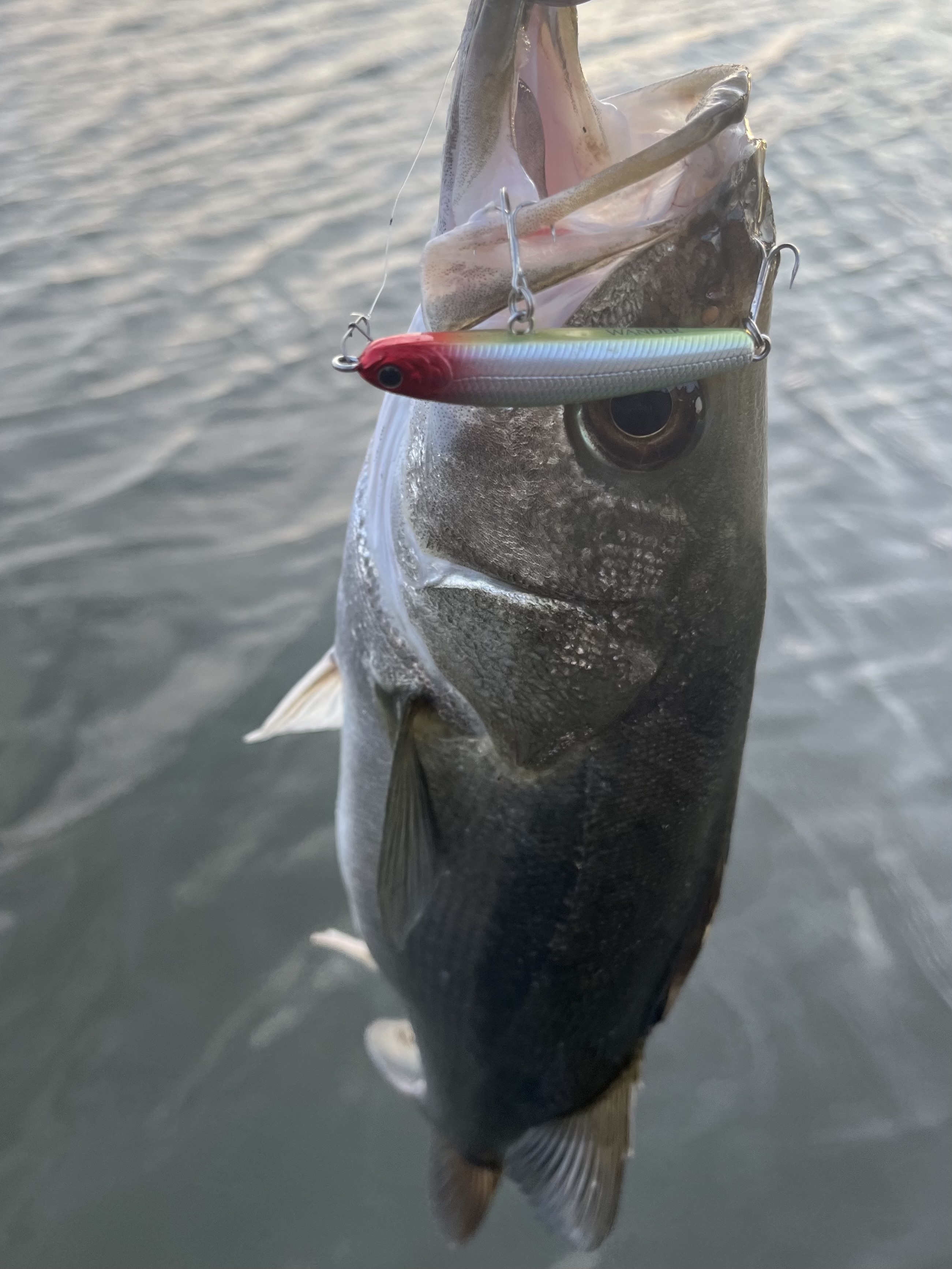 トップを投げていたので少しレンジを入れようとラッキークラフトさんのワンダー60に替え水面直下を流すとすぐにヒット!しかしエラ洗いでバラし…その後すぐワンダーをキャストするとまたヒット!50cm程でしたがシーバスをキャッチ!また同じパターンでヒット!