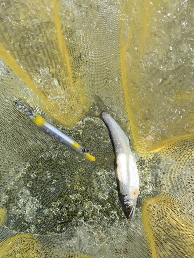ルアーはダイワさんのアユイングミノーレーザーインパクト94SPで群れの中に入れるとギラッ!ようやく3匹目!