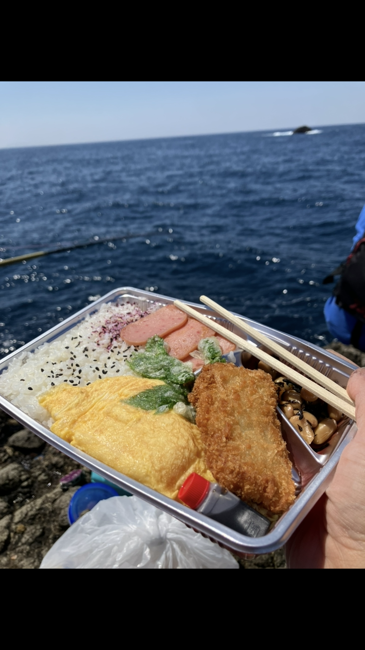 日が完全に昇るとアタリが少なくなった所で、船長が磯まで届けてくれるお弁当を食べて小休止。