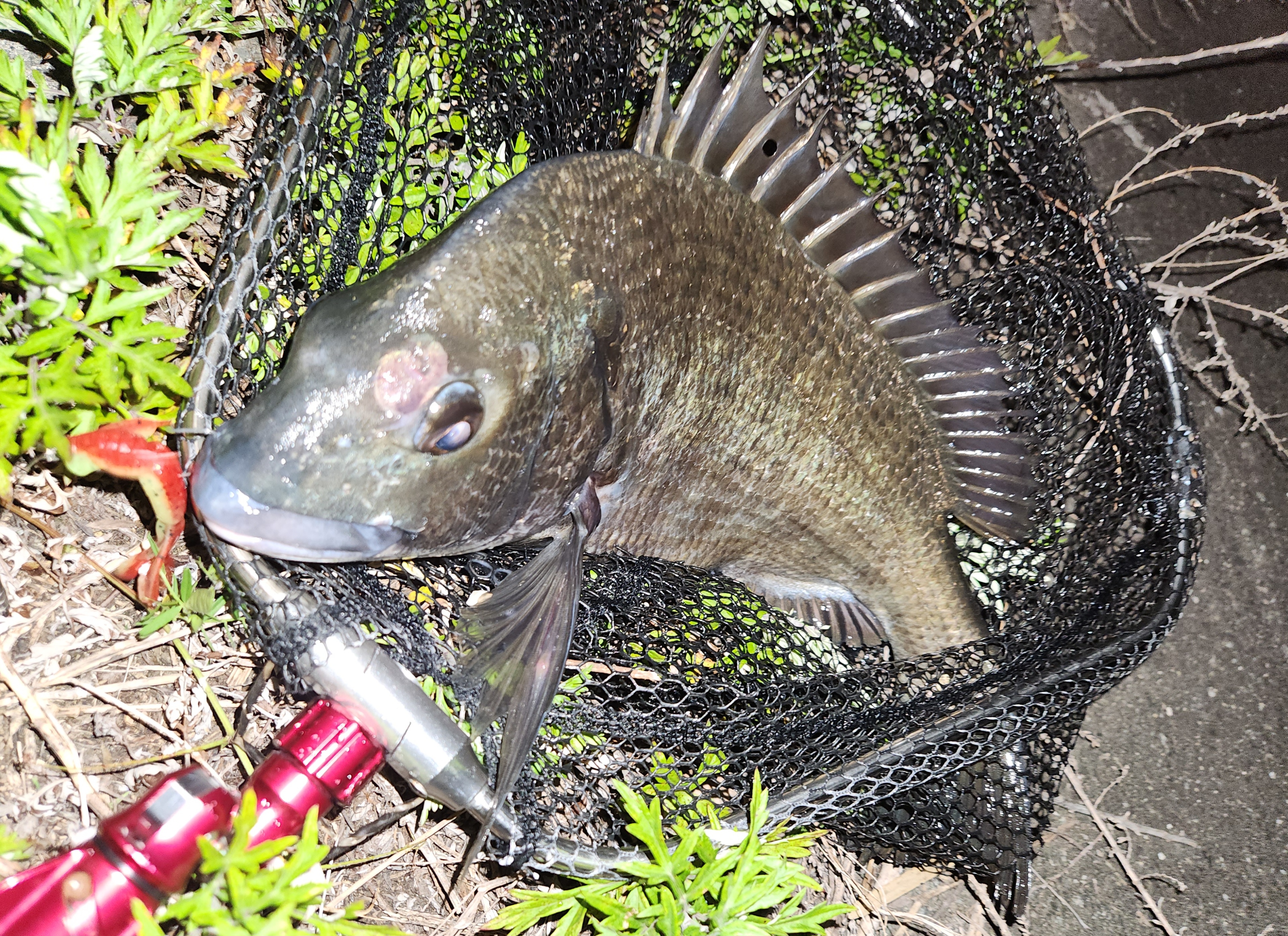 干潮潮止まり付近から開始。まだ少し流れはあるのでチャンスはあるかも。フリーリグのシンカーはタングステン10gで底をずる引きます。するとゴンゴンとチヌっぽいアタリが!そのまま巻くと追い食いしてきたのであわせてヒット!よく引いてドラグを出してくれます。無事釣れたのは40cmくらいのチヌでした!